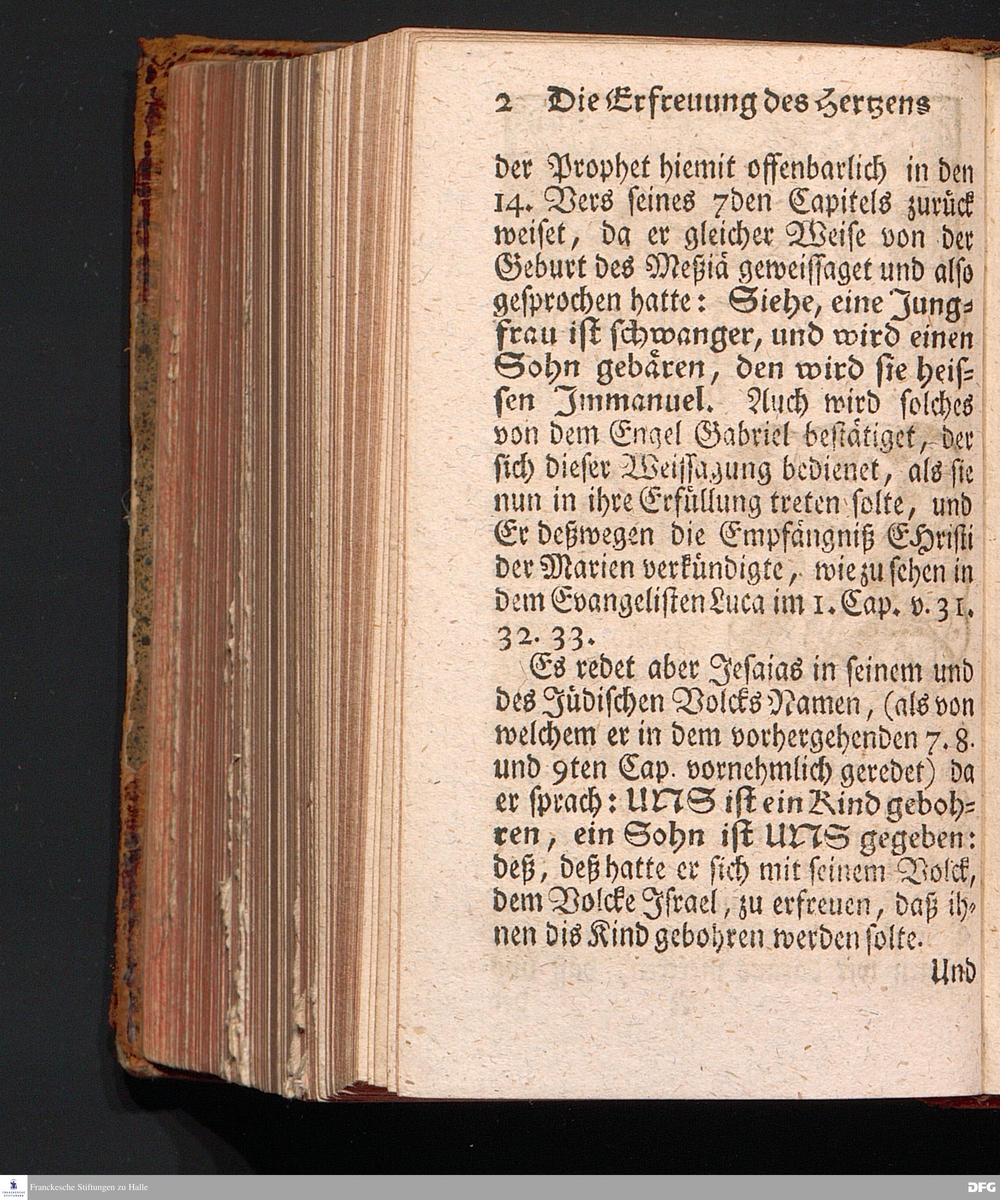 Die Erfreuung des Menschlichen Hertzens Durch die Geburt CHRISTI, Am I.Christ=Tage A.1717. In einer Uber den ordentlichen Evangelischen Text Luc.II, 1=14. In der Stadt=Kirchen zu Blaubeuren im Hertzogthum Würtemberg Auf Erfordern Sr.Hochwürden des jetzigen Herrn Prälaten und gantzen Ministerii daselbst, gehaltenen Predigt vorgestellet Und auf Begehren zum Druck gegeben von August Hermann Francken, S.Theol.Prof.Past.und Scholarcha zu Halle im Hertzogthum Magdeburg. Vierte Auflage, Nach dem zu Ulm gedruckten Exemplar. HALLE, gedruckt im Wäysen=Hause, 1740.