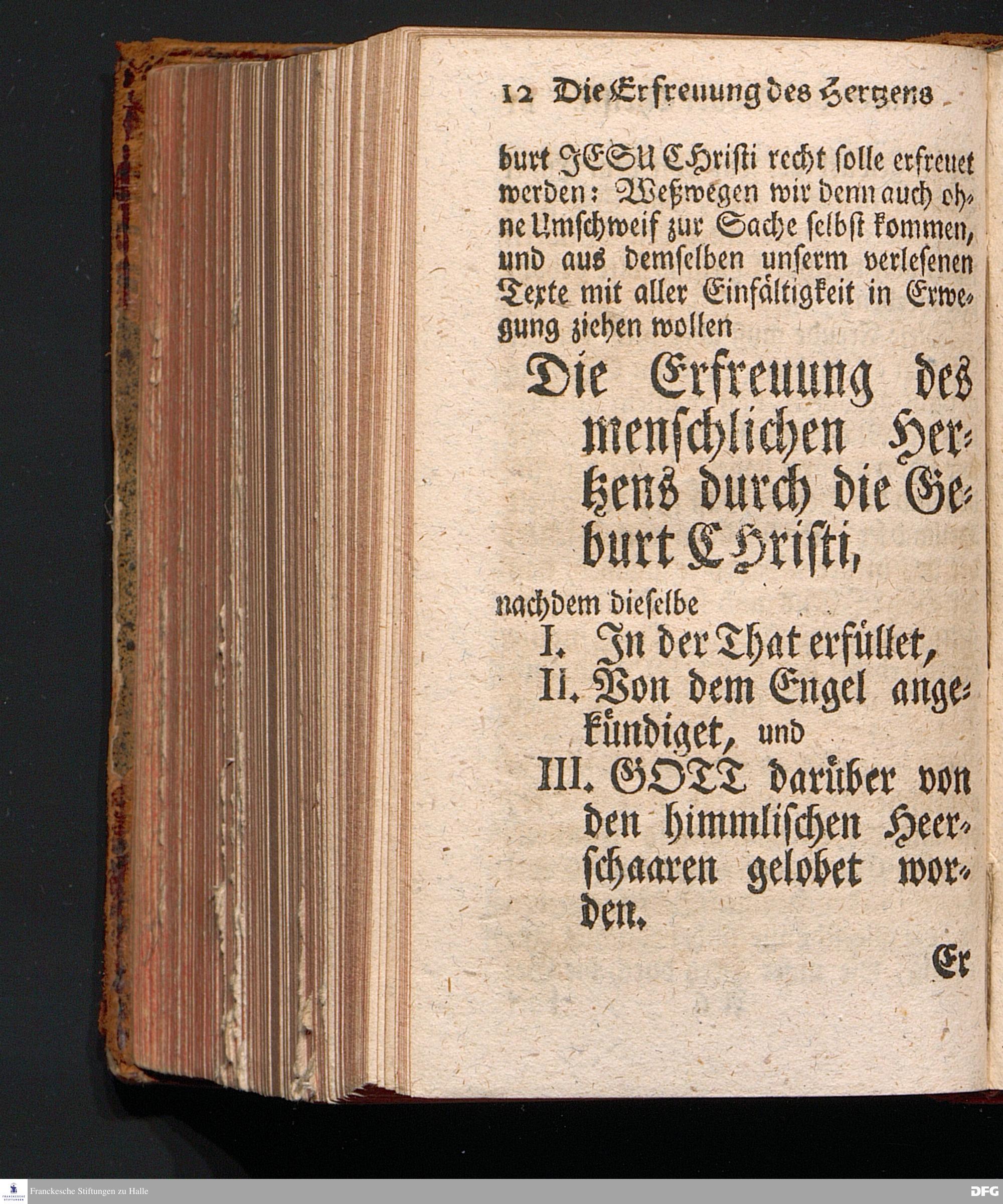 Die Erfreuung des Menschlichen Hertzens Durch die Geburt CHRISTI, Am I.Christ=Tage A.1717. In einer Uber den ordentlichen Evangelischen Text Luc.II, 1=14. In der Stadt=Kirchen zu Blaubeuren im Hertzogthum Würtemberg Auf Erfordern Sr.Hochwürden des jetzigen Herrn Prälaten und gantzen Ministerii daselbst, gehaltenen Predigt vorgestellet Und auf Begehren zum Druck gegeben von August Hermann Francken, S.Theol.Prof.Past.und Scholarcha zu Halle im Hertzogthum Magdeburg. Vierte Auflage, Nach dem zu Ulm gedruckten Exemplar. HALLE, gedruckt im Wäysen=Hause, 1740.