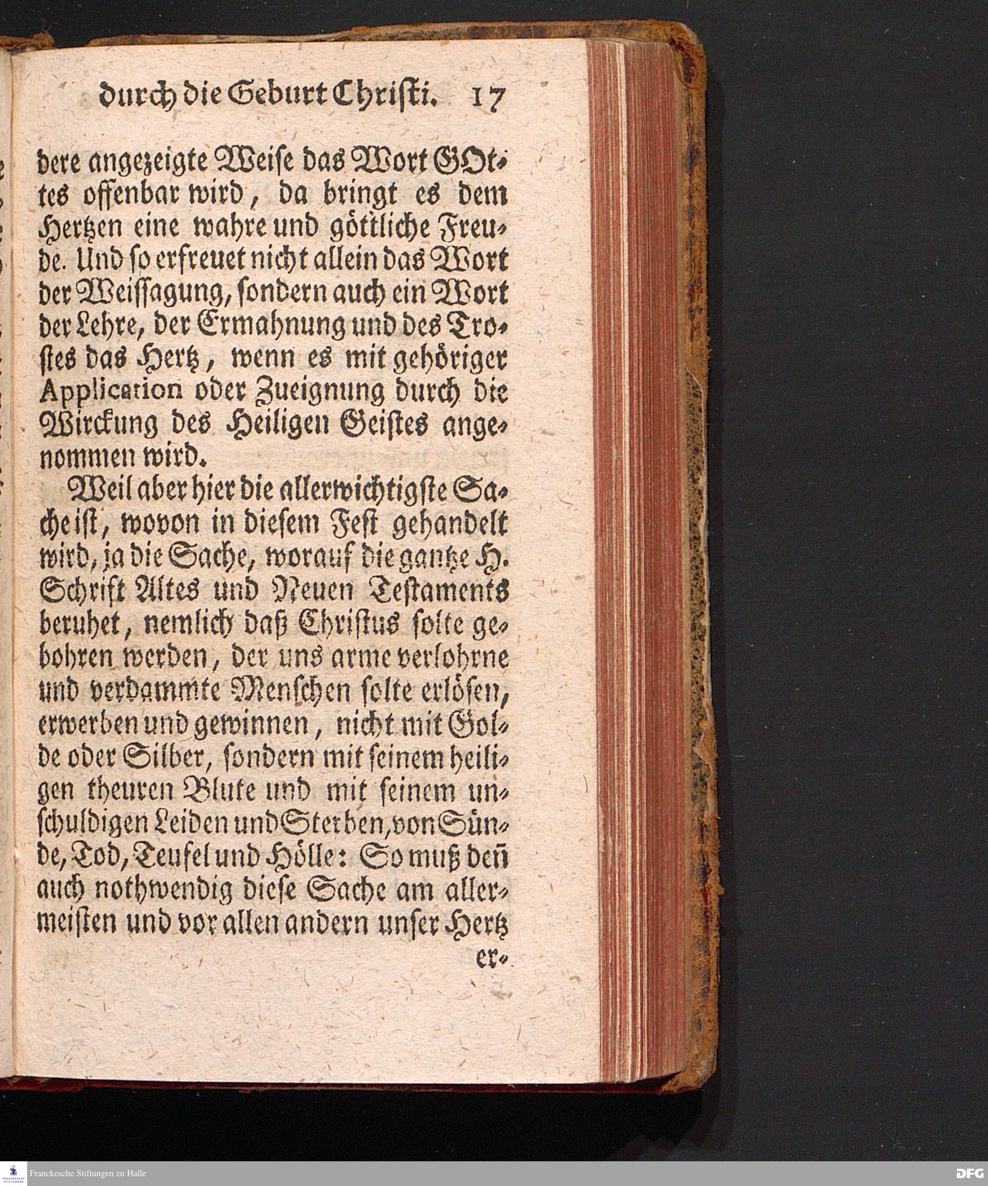 Die Erfreuung des Menschlichen Hertzens Durch die Geburt CHRISTI, Am I.Christ=Tage A.1717. In einer Uber den ordentlichen Evangelischen Text Luc.II, 1=14. In der Stadt=Kirchen zu Blaubeuren im Hertzogthum Würtemberg Auf Erfordern Sr.Hochwürden des jetzigen Herrn Prälaten und gantzen Ministerii daselbst, gehaltenen Predigt vorgestellet Und auf Begehren zum Druck gegeben von August Hermann Francken, S.Theol.Prof.Past.und Scholarcha zu Halle im Hertzogthum Magdeburg. Vierte Auflage, Nach dem zu Ulm gedruckten Exemplar. HALLE, gedruckt im Wäysen=Hause, 1740.