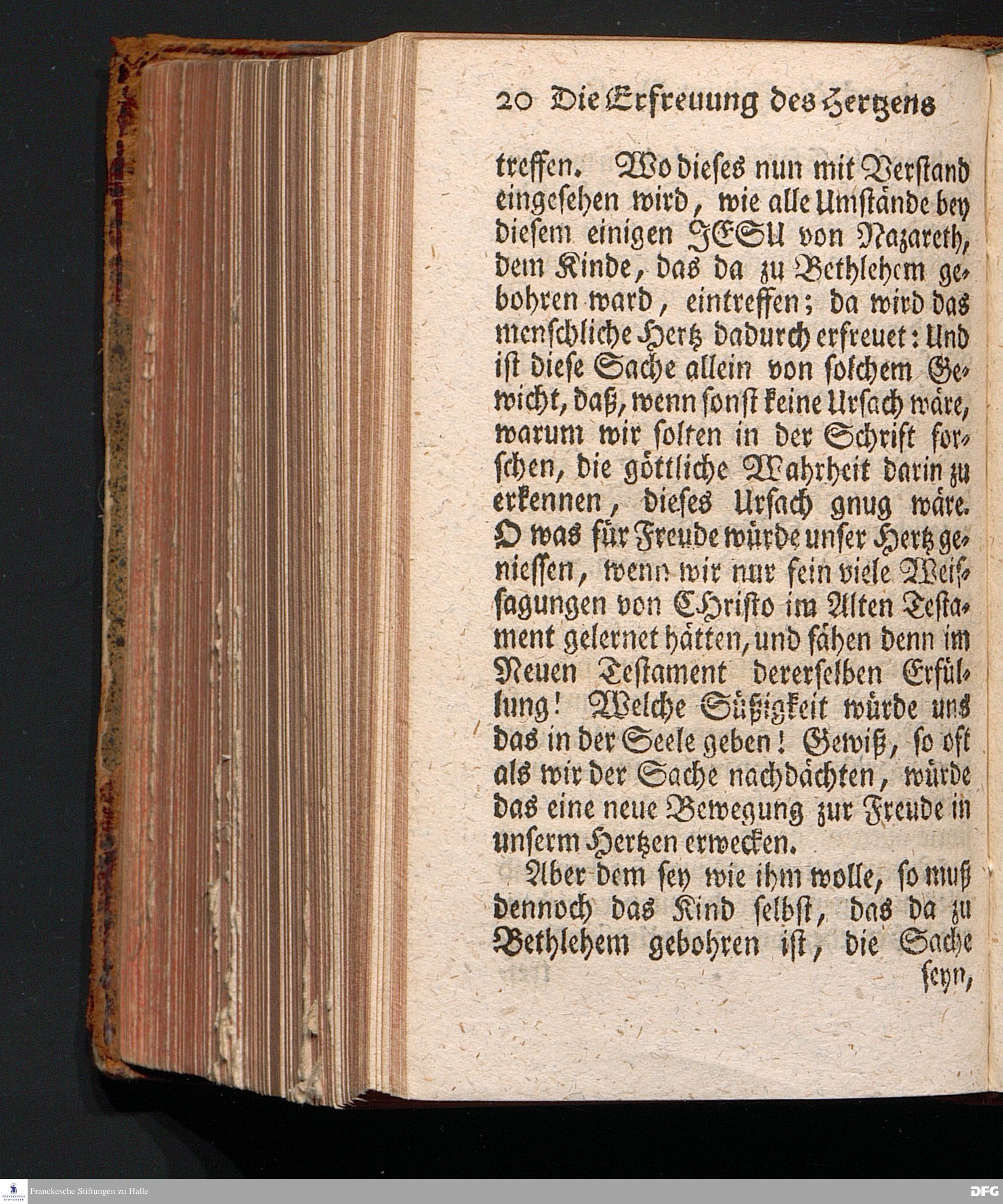 Die Erfreuung des Menschlichen Hertzens Durch die Geburt CHRISTI, Am I.Christ=Tage A.1717. In einer Uber den ordentlichen Evangelischen Text Luc.II, 1=14. In der Stadt=Kirchen zu Blaubeuren im Hertzogthum Würtemberg Auf Erfordern Sr.Hochwürden des jetzigen Herrn Prälaten und gantzen Ministerii daselbst, gehaltenen Predigt vorgestellet Und auf Begehren zum Druck gegeben von August Hermann Francken, S.Theol.Prof.Past.und Scholarcha zu Halle im Hertzogthum Magdeburg. Vierte Auflage, Nach dem zu Ulm gedruckten Exemplar. HALLE, gedruckt im Wäysen=Hause, 1740.