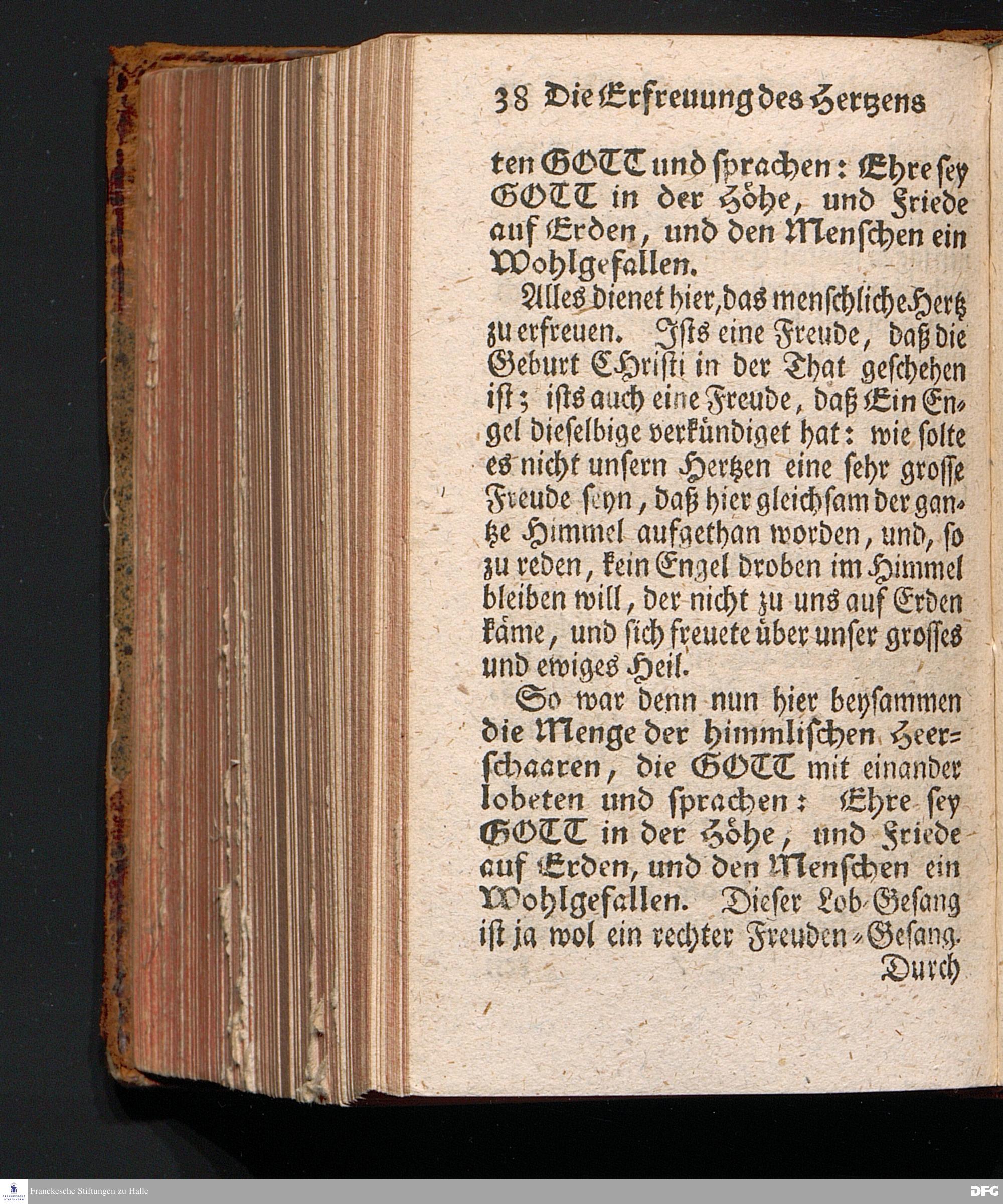 Die Erfreuung des Menschlichen Hertzens Durch die Geburt CHRISTI, Am I.Christ=Tage A.1717. In einer Uber den ordentlichen Evangelischen Text Luc.II, 1=14. In der Stadt=Kirchen zu Blaubeuren im Hertzogthum Würtemberg Auf Erfordern Sr.Hochwürden des jetzigen Herrn Prälaten und gantzen Ministerii daselbst, gehaltenen Predigt vorgestellet Und auf Begehren zum Druck gegeben von August Hermann Francken, S.Theol.Prof.Past.und Scholarcha zu Halle im Hertzogthum Magdeburg. Vierte Auflage, Nach dem zu Ulm gedruckten Exemplar. HALLE, gedruckt im Wäysen=Hause, 1740.