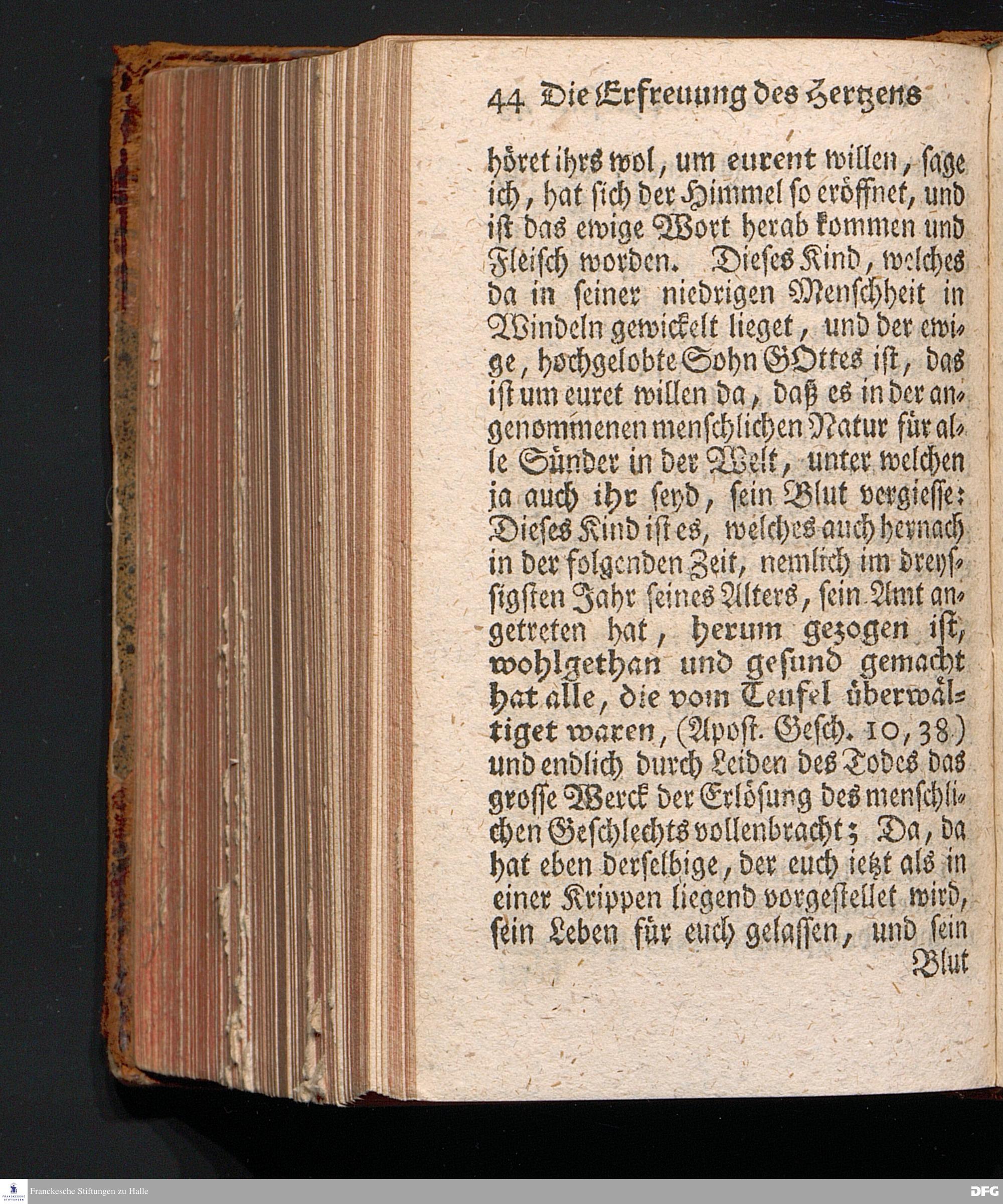 Die Erfreuung des Menschlichen Hertzens Durch die Geburt CHRISTI, Am I.Christ=Tage A.1717. In einer Uber den ordentlichen Evangelischen Text Luc.II, 1=14. In der Stadt=Kirchen zu Blaubeuren im Hertzogthum Würtemberg Auf Erfordern Sr.Hochwürden des jetzigen Herrn Prälaten und gantzen Ministerii daselbst, gehaltenen Predigt vorgestellet Und auf Begehren zum Druck gegeben von August Hermann Francken, S.Theol.Prof.Past.und Scholarcha zu Halle im Hertzogthum Magdeburg. Vierte Auflage, Nach dem zu Ulm gedruckten Exemplar. HALLE, gedruckt im Wäysen=Hause, 1740.