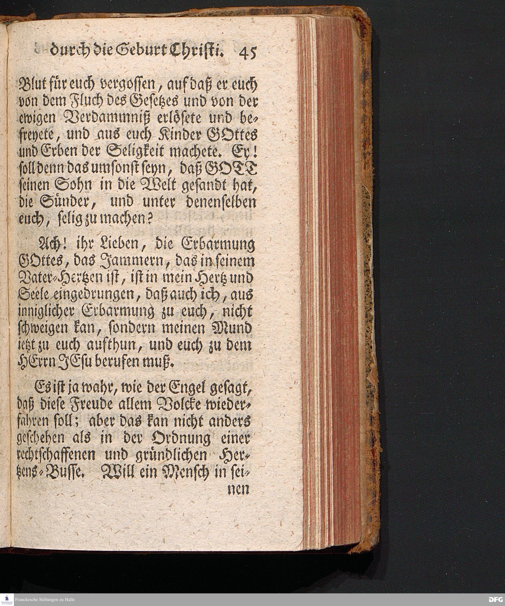 Die Erfreuung des Menschlichen Hertzens Durch die Geburt CHRISTI, Am I.Christ=Tage A.1717. In einer Uber den ordentlichen Evangelischen Text Luc.II, 1=14. In der Stadt=Kirchen zu Blaubeuren im Hertzogthum Würtemberg Auf Erfordern Sr.Hochwürden des jetzigen Herrn Prälaten und gantzen Ministerii daselbst, gehaltenen Predigt vorgestellet Und auf Begehren zum Druck gegeben von August Hermann Francken, S.Theol.Prof.Past.und Scholarcha zu Halle im Hertzogthum Magdeburg. Vierte Auflage, Nach dem zu Ulm gedruckten Exemplar. HALLE, gedruckt im Wäysen=Hause, 1740.