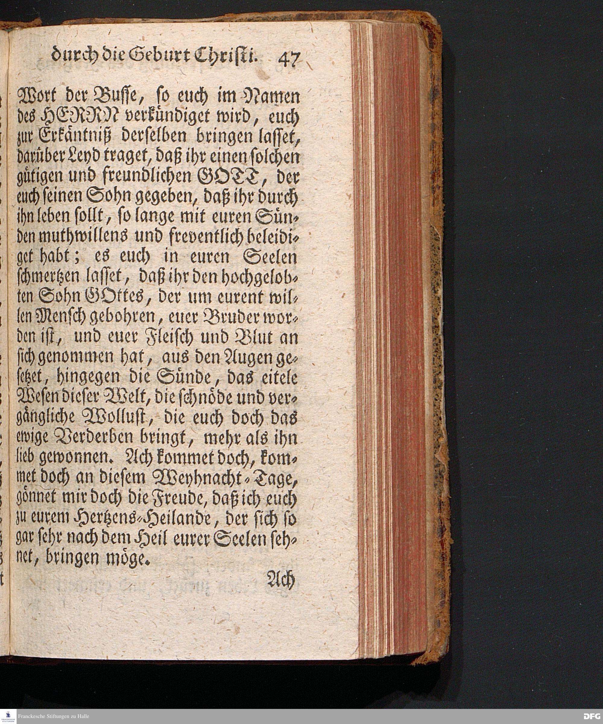Die Erfreuung des Menschlichen Hertzens Durch die Geburt CHRISTI, Am I.Christ=Tage A.1717. In einer Uber den ordentlichen Evangelischen Text Luc.II, 1=14. In der Stadt=Kirchen zu Blaubeuren im Hertzogthum Würtemberg Auf Erfordern Sr.Hochwürden des jetzigen Herrn Prälaten und gantzen Ministerii daselbst, gehaltenen Predigt vorgestellet Und auf Begehren zum Druck gegeben von August Hermann Francken, S.Theol.Prof.Past.und Scholarcha zu Halle im Hertzogthum Magdeburg. Vierte Auflage, Nach dem zu Ulm gedruckten Exemplar. HALLE, gedruckt im Wäysen=Hause, 1740.
