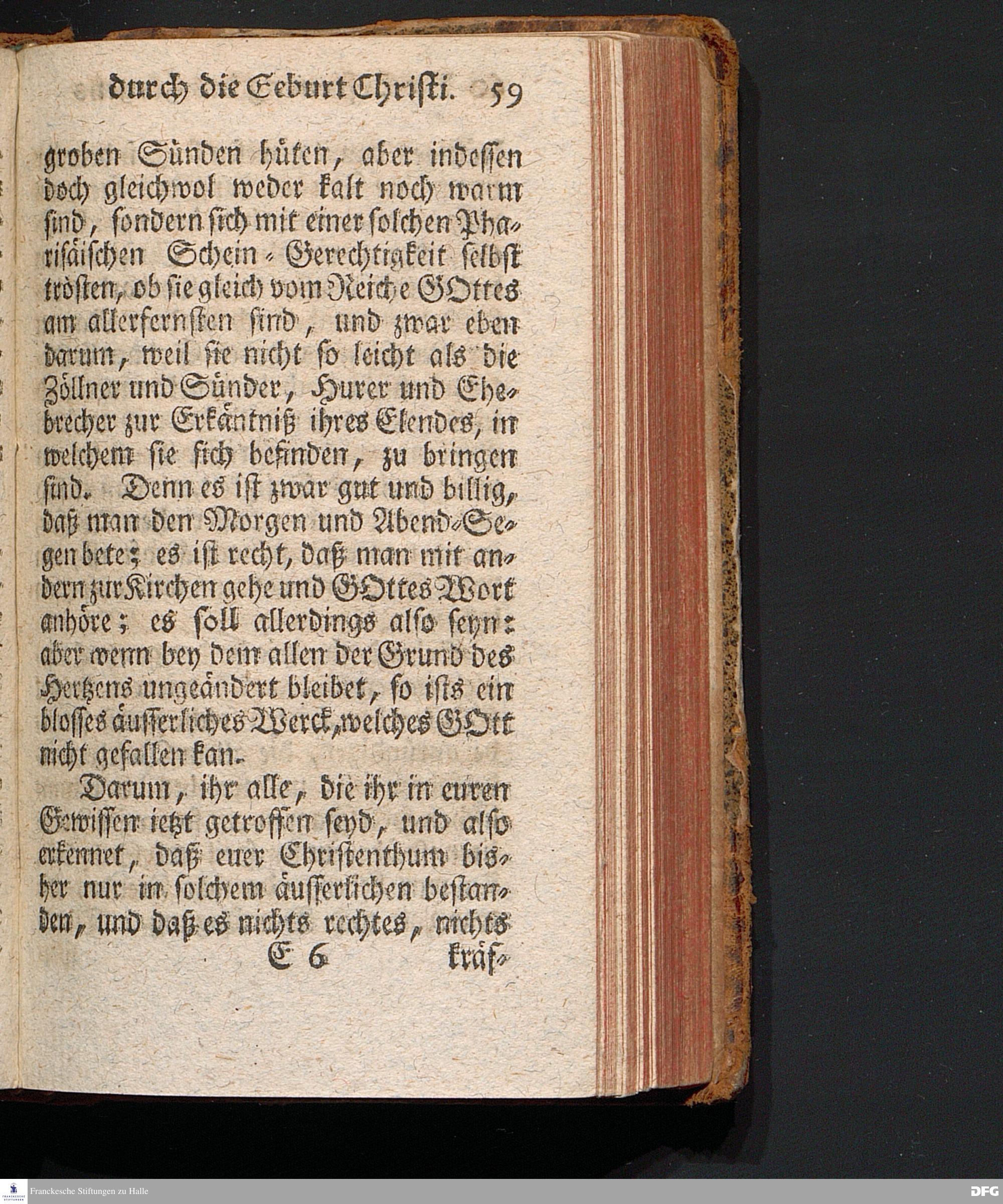Die Erfreuung des Menschlichen Hertzens Durch die Geburt CHRISTI, Am I.Christ=Tage A.1717. In einer Uber den ordentlichen Evangelischen Text Luc.II, 1=14. In der Stadt=Kirchen zu Blaubeuren im Hertzogthum Würtemberg Auf Erfordern Sr.Hochwürden des jetzigen Herrn Prälaten und gantzen Ministerii daselbst, gehaltenen Predigt vorgestellet Und auf Begehren zum Druck gegeben von August Hermann Francken, S.Theol.Prof.Past.und Scholarcha zu Halle im Hertzogthum Magdeburg. Vierte Auflage, Nach dem zu Ulm gedruckten Exemplar. HALLE, gedruckt im Wäysen=Hause, 1740.
