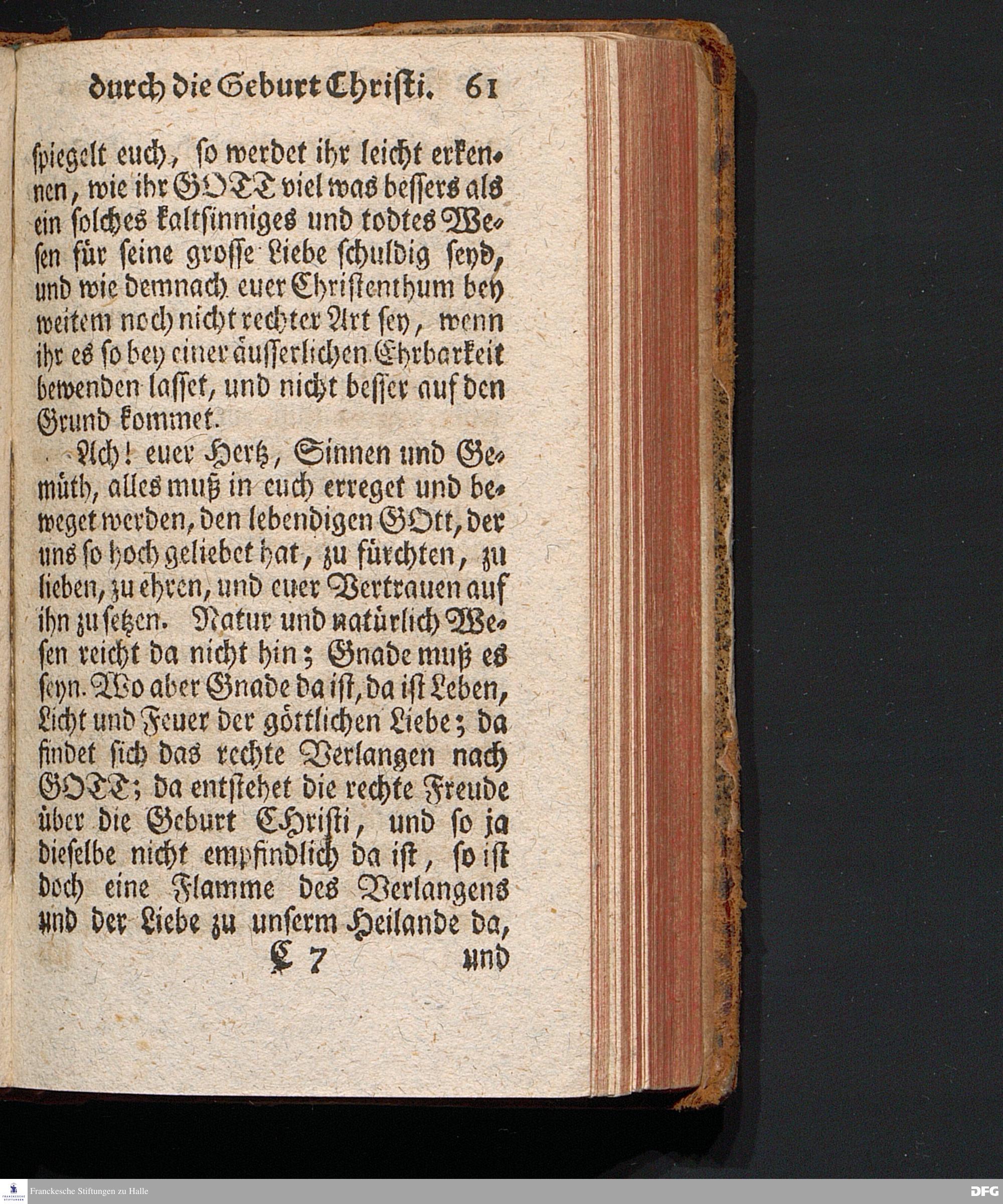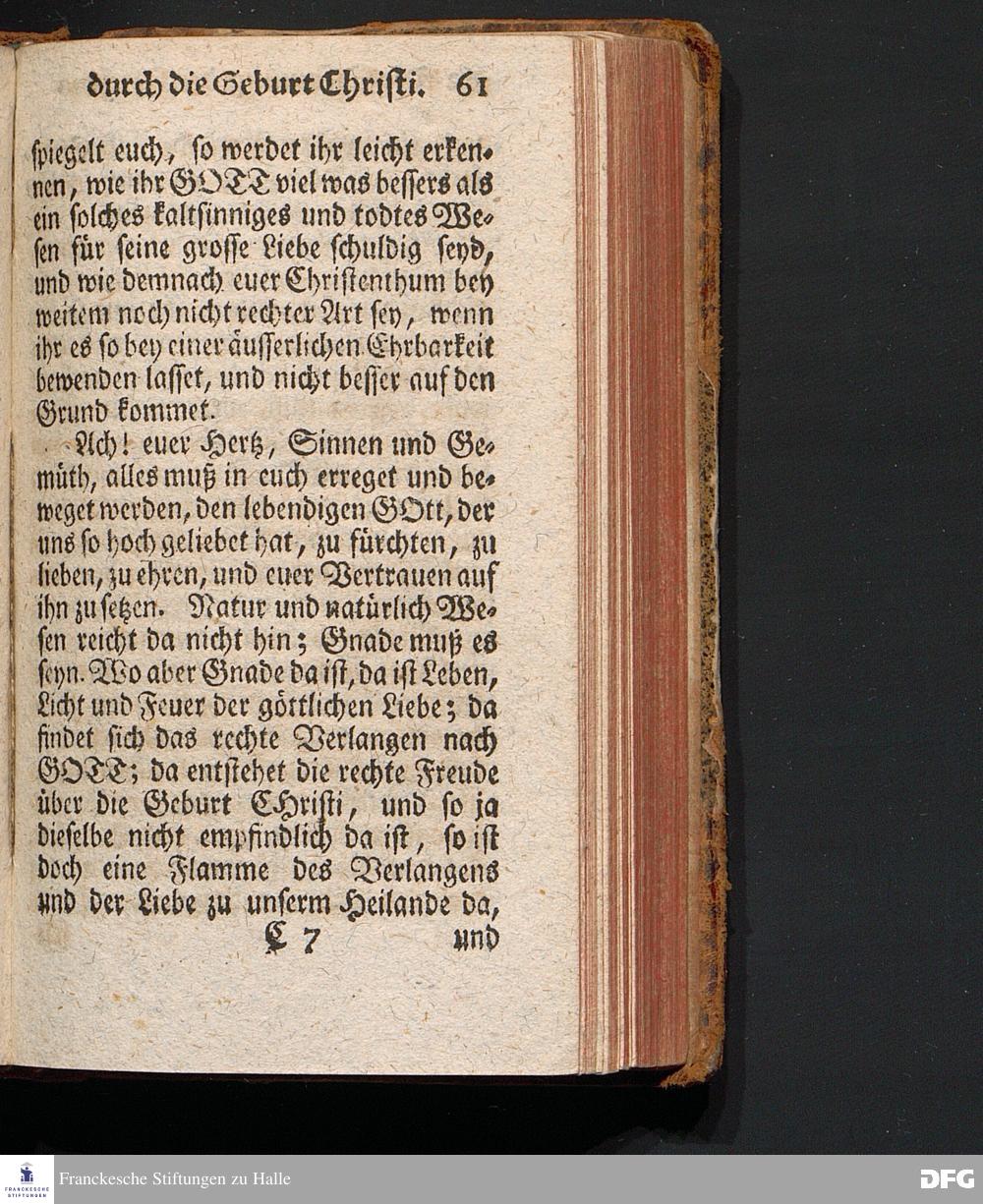 Die Erfreuung des Menschlichen Hertzens Durch die Geburt CHRISTI, Am I.Christ=Tage A.1717. In einer Uber den ordentlichen Evangelischen Text Luc.II, 1=14. In der Stadt=Kirchen zu Blaubeuren im Hertzogthum Würtemberg Auf Erfordern Sr.Hochwürden des jetzigen Herrn Prälaten und gantzen Ministerii daselbst, gehaltenen Predigt vorgestellet Und auf Begehren zum Druck gegeben von August Hermann Francken, S.Theol.Prof.Past.und Scholarcha zu Halle im Hertzogthum Magdeburg. Vierte Auflage, Nach dem zu Ulm gedruckten Exemplar. HALLE, gedruckt im Wäysen=Hause, 1740.