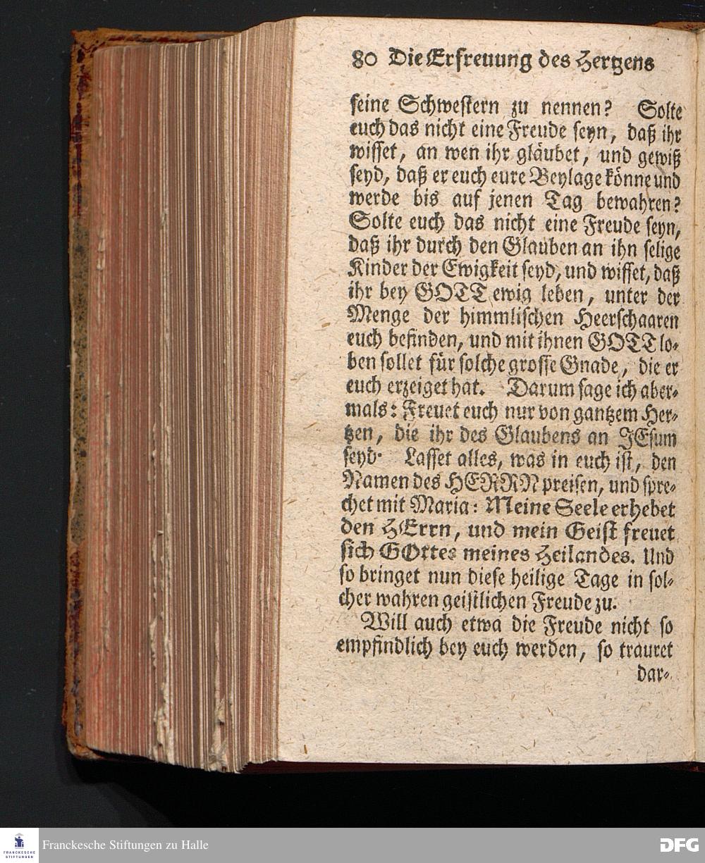 Die Erfreuung des Menschlichen Hertzens Durch die Geburt CHRISTI, Am I.Christ=Tage A.1717. In einer Uber den ordentlichen Evangelischen Text Luc.II, 1=14. In der Stadt=Kirchen zu Blaubeuren im Hertzogthum Würtemberg Auf Erfordern Sr.Hochwürden des jetzigen Herrn Prälaten und gantzen Ministerii daselbst, gehaltenen Predigt vorgestellet Und auf Begehren zum Druck gegeben von August Hermann Francken, S.Theol.Prof.Past.und Scholarcha zu Halle im Hertzogthum Magdeburg. Vierte Auflage, Nach dem zu Ulm gedruckten Exemplar. HALLE, gedruckt im Wäysen=Hause, 1740.