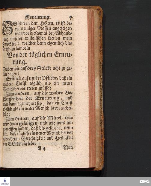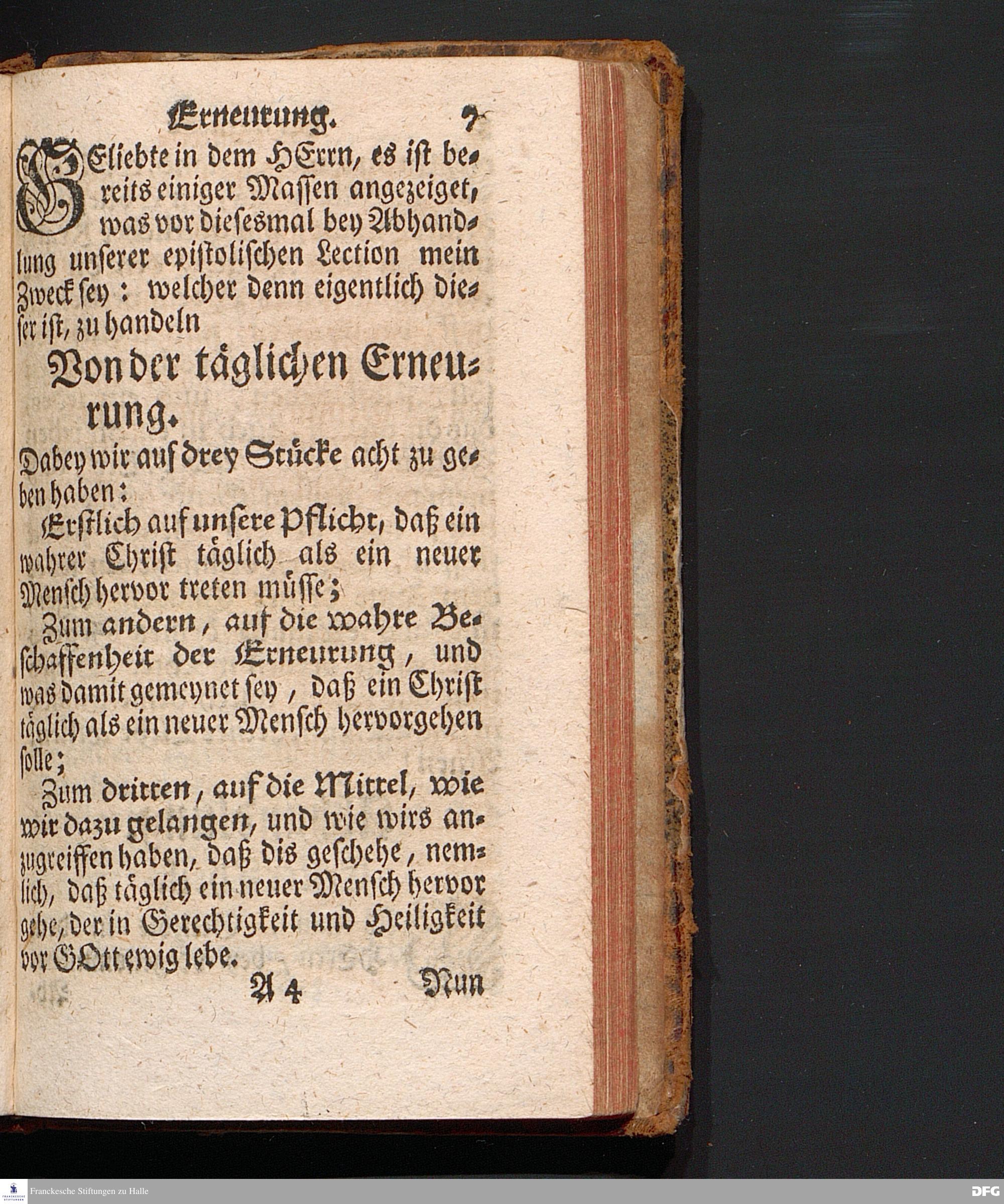 Die Tägliche Erneurung, I) Nach der uns obliegenden Pflicht, II) Nach ihrer wahren Beschaffenheit, III) Nach denen dazu dienlichen Mitteln. Aus der Epistolischen Lection Ephes.IV, 22-28. Am XIX.Sonnt.nach Trinitatis Anno MDCCXIII. In der Schul=Kirche zu Halle vorgestellet von August Hermann Francken, S.Theol.Prof.Ord.Past.Vlric.& Scholarcha. Dritte Auflage. HALLE, In Verlegung des Wäysen=Hauses. MDCCXXXII.