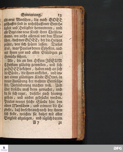 Die Tägliche Erneurung, I) Nach der uns obliegenden Pflicht, II) Nach ihrer wahren Beschaffenheit, III) Nach denen dazu dienlichen Mitteln. Aus der Epistolischen Lection Ephes.IV, 22-28. Am XIX.Sonnt.nach Trinitatis Anno MDCCXIII. In der Schul=Kirche zu Halle vorgestellet von August Hermann Francken, S.Theol.Prof.Ord.Past.Vlric.& Scholarcha. Dritte Auflage. HALLE, In Verlegung des Wäysen=Hauses. MDCCXXXII.