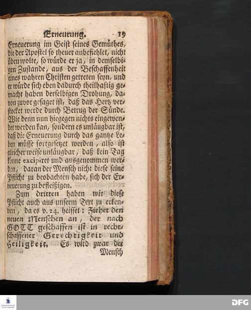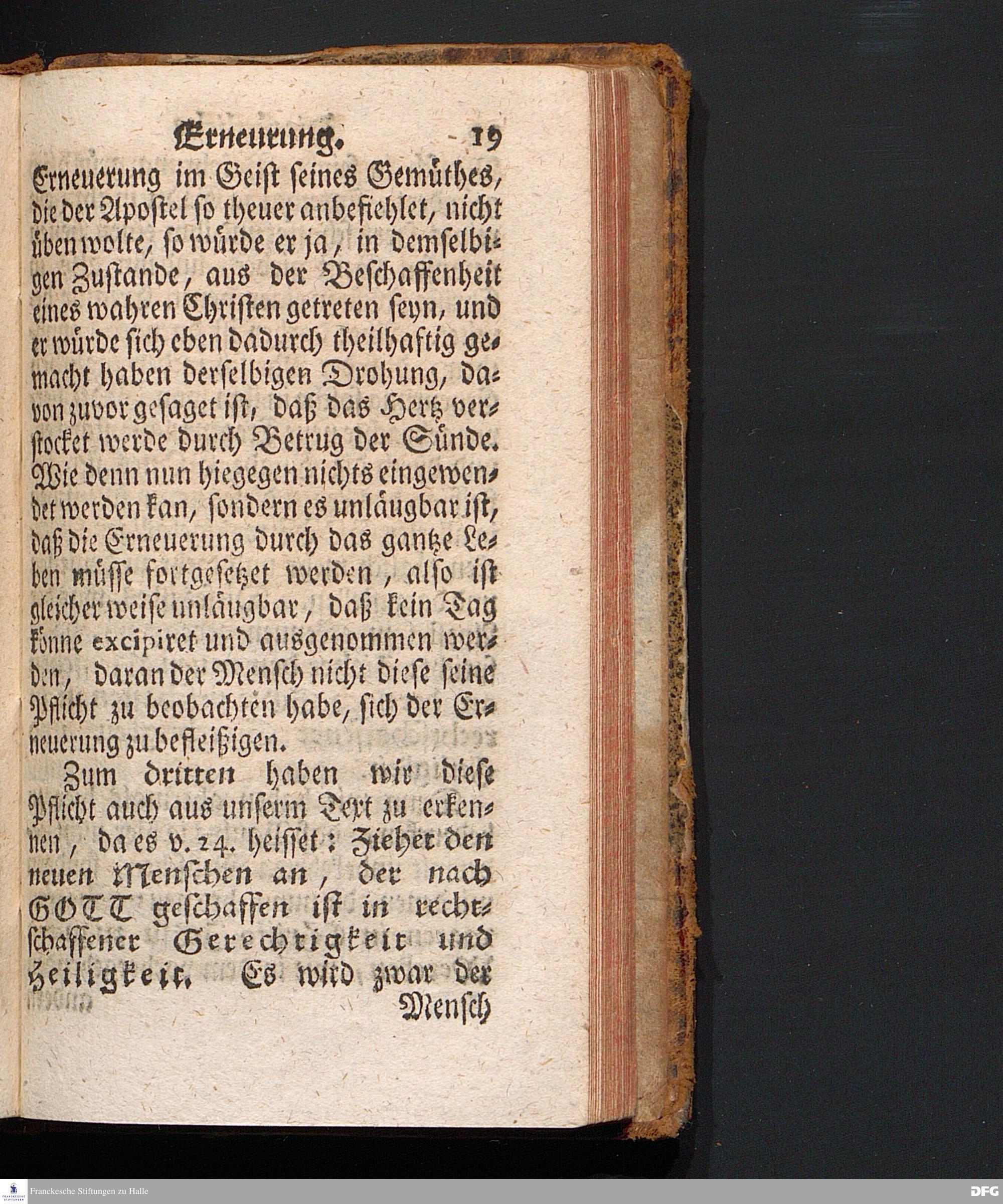 Die Tägliche Erneurung, I) Nach der uns obliegenden Pflicht, II) Nach ihrer wahren Beschaffenheit, III) Nach denen dazu dienlichen Mitteln. Aus der Epistolischen Lection Ephes.IV, 22-28. Am XIX.Sonnt.nach Trinitatis Anno MDCCXIII. In der Schul=Kirche zu Halle vorgestellet von August Hermann Francken, S.Theol.Prof.Ord.Past.Vlric.& Scholarcha. Dritte Auflage. HALLE, In Verlegung des Wäysen=Hauses. MDCCXXXII.