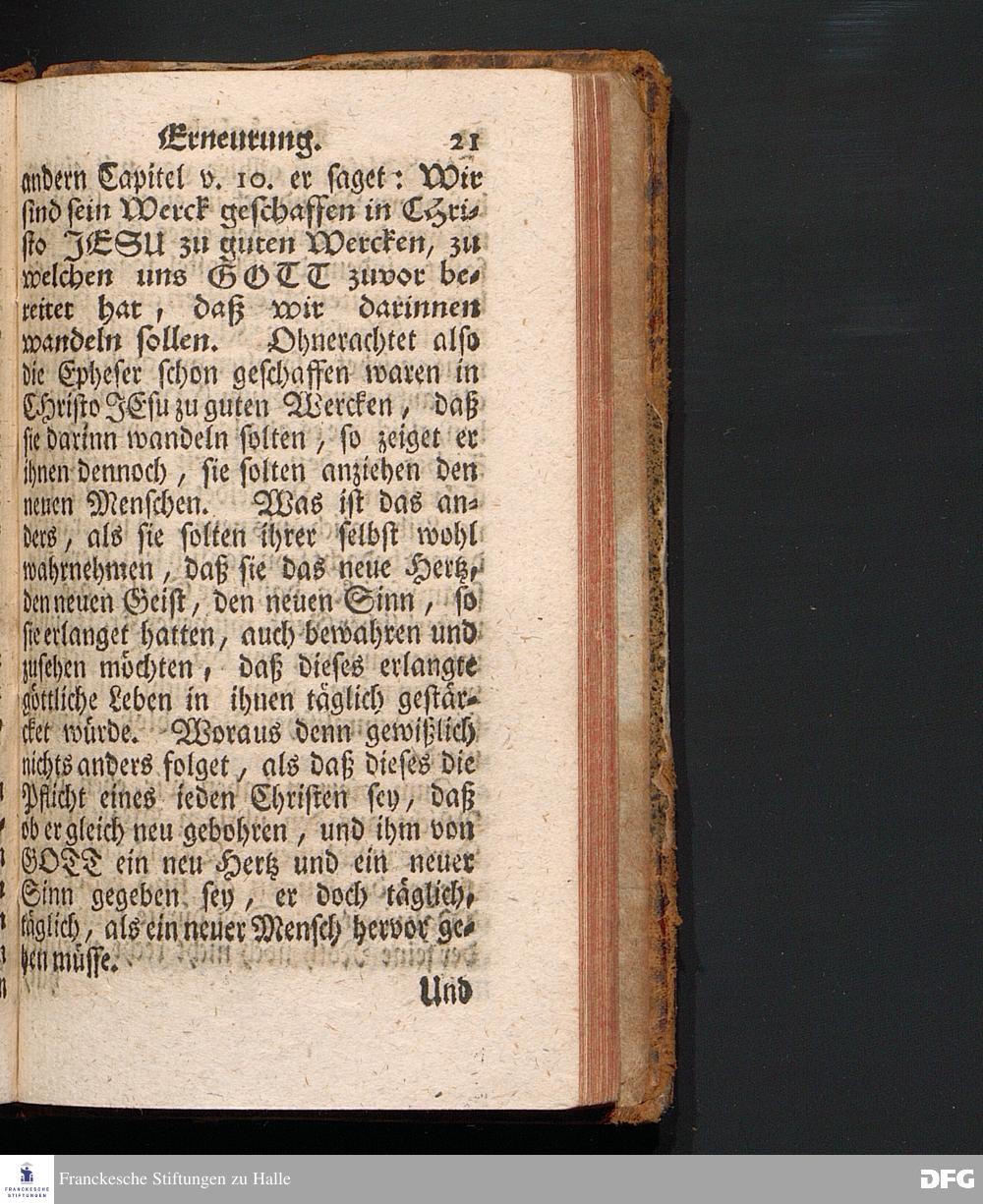 Die Tägliche Erneurung, I) Nach der uns obliegenden Pflicht, II) Nach ihrer wahren Beschaffenheit, III) Nach denen dazu dienlichen Mitteln. Aus der Epistolischen Lection Ephes.IV, 22-28. Am XIX.Sonnt.nach Trinitatis Anno MDCCXIII. In der Schul=Kirche zu Halle vorgestellet von August Hermann Francken, S.Theol.Prof.Ord.Past.Vlric.& Scholarcha. Dritte Auflage. HALLE, In Verlegung des Wäysen=Hauses. MDCCXXXII.