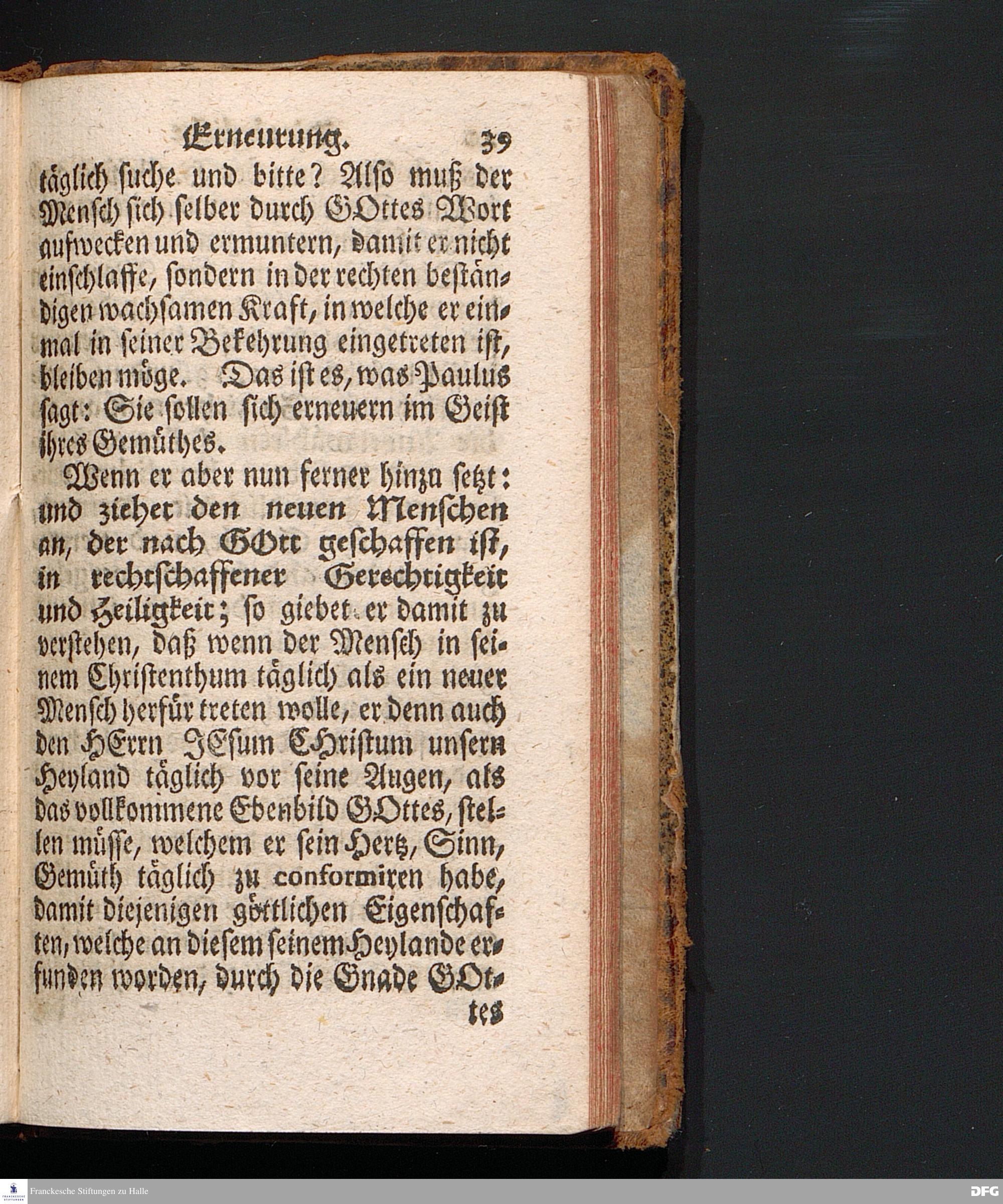 Die Tägliche Erneurung, I) Nach der uns obliegenden Pflicht, II) Nach ihrer wahren Beschaffenheit, III) Nach denen dazu dienlichen Mitteln. Aus der Epistolischen Lection Ephes.IV, 22-28. Am XIX.Sonnt.nach Trinitatis Anno MDCCXIII. In der Schul=Kirche zu Halle vorgestellet von August Hermann Francken, S.Theol.Prof.Ord.Past.Vlric.& Scholarcha. Dritte Auflage. HALLE, In Verlegung des Wäysen=Hauses. MDCCXXXII.