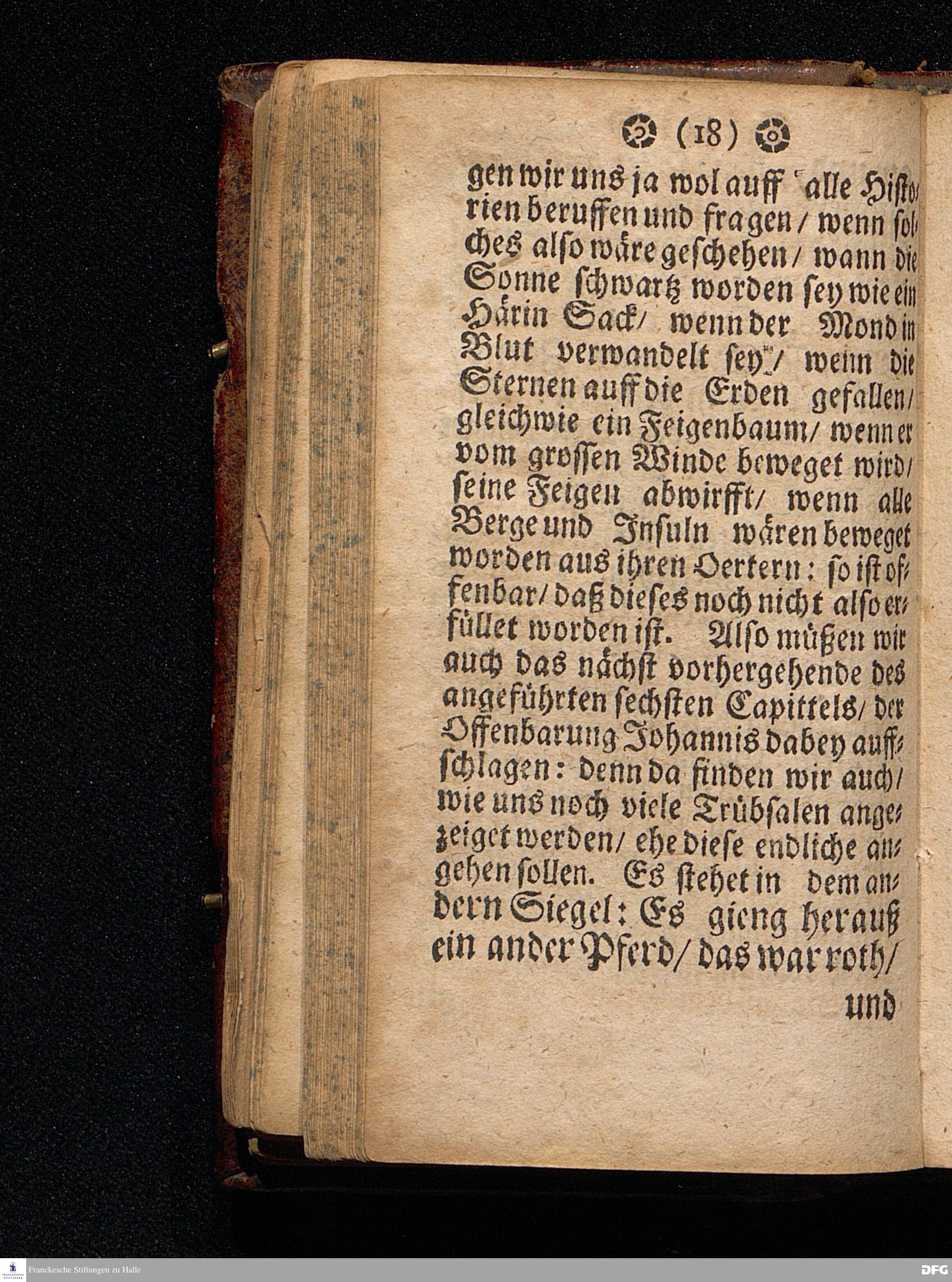 Die Grossen Trübsalen / welche vor der Zukunfft CHristi werden vorher gehen / und die Bereitung zu denselben. In einer Predigt Am 2.Advent=Sonntage Uber das Evangelium Luc.XXI, v.25==36. Anno 1696. In der St.Georgen Kirche zu Glaucha an Halle vorgestellet von M.August Hermann Francken / SS.Theol.P.Ord.& P.Glauch. HALLE / Gedruckt bey Ch.Henck[el].U.B.