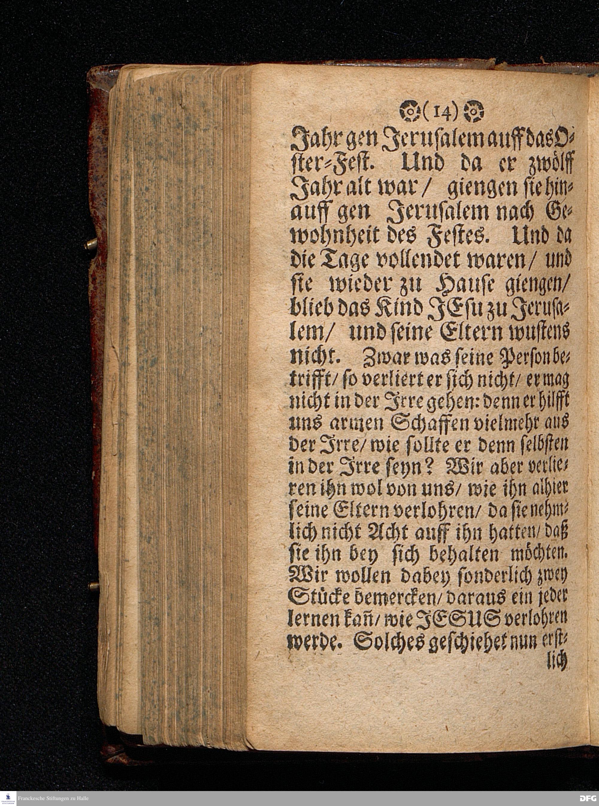 Das Schmertzhaffte Suchen unsers Herrn JEsu / Am I.Sonntag Epiphan. Anno 1697. In einer Predigt Uber das Evangelium Luc.II.V, 41--52 In der St.Georgen=Kirche zu Glaucha an Halle vorgestellet / von M.August Hermann Francken / SS.Theol.P.Ord.& P.Glauch. HALLE / Gedruckt bey Christian Henckeln / Univers.Buchdr.1700.