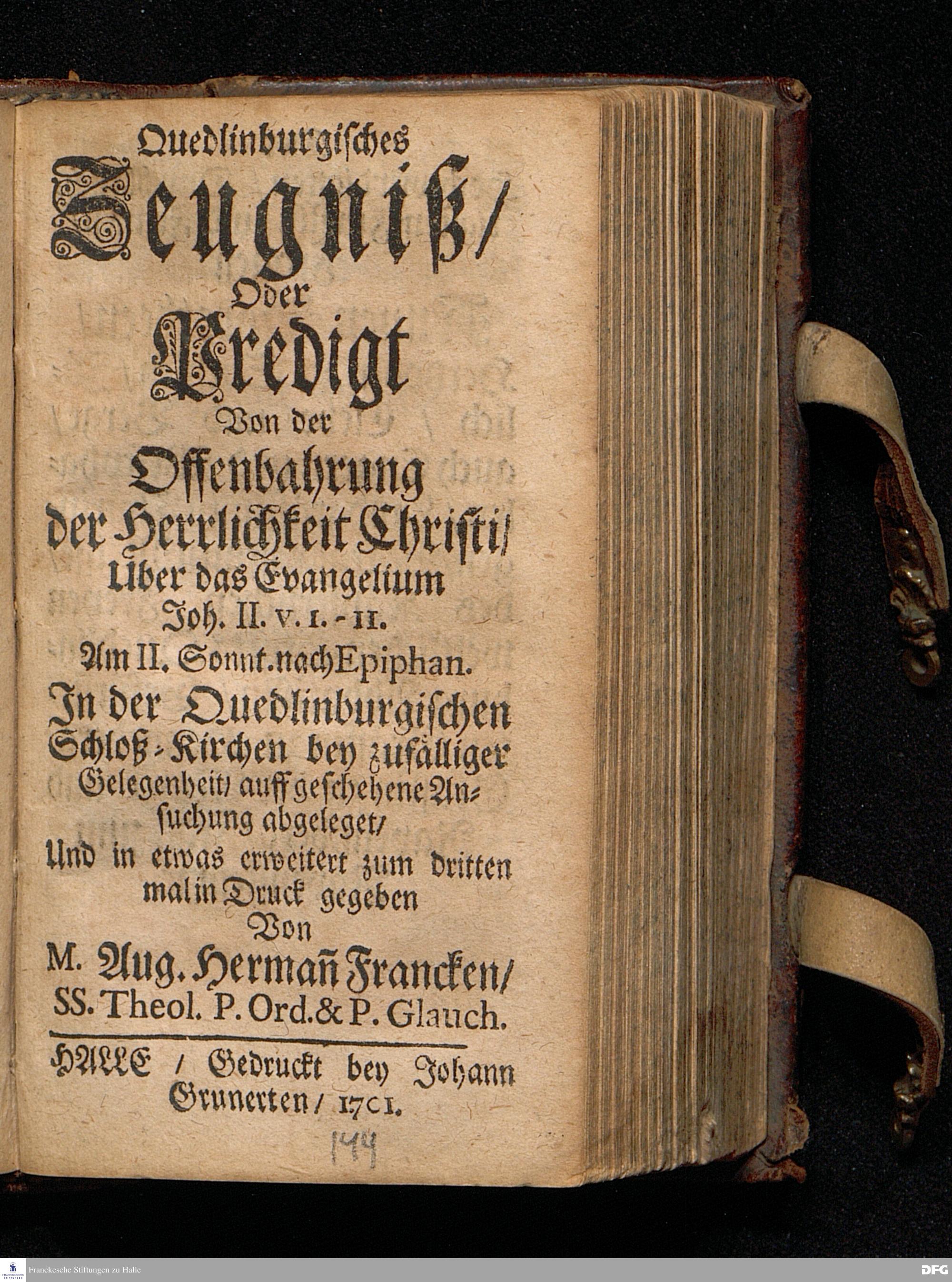 Quedlinburgisches Zeugniß / Oder Predigt Von der Offenbahrung der Herrlichkeit Christi / Uber das Evangelium Joh.II. V.1-11. Am II.Sonnt.nach Epiphan. In der Quedlinburgischen Schloß=Kirchen bey zufälliger Gelegenheit / auff geschehene Ansuchung abgeleget / Und in etwas erweitert zum dritten mal in Druck gegeben Von M. Aug. Hermañ Francken / SS.Theol.P.Ord.& P.Glauch. HALLE / Gedruckt bey Johann Grunerten / 1701.