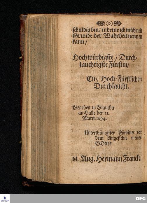 Quedlinburgisches Zeugniß / Oder Predigt Von der Offenbahrung der Herrlichkeit Christi / Uber das Evangelium Joh.II. V.1-11. Am II.Sonnt.nach Epiphan. In der Quedlinburgischen Schloß=Kirchen bey zufälliger Gelegenheit / auff geschehene Ansuchung abgeleget / Und in etwas erweitert zum dritten mal in Druck gegeben Von M. Aug. Hermañ Francken / SS.Theol.P.Ord.& P.Glauch. HALLE / Gedruckt bey Johann Grunerten / 1701.