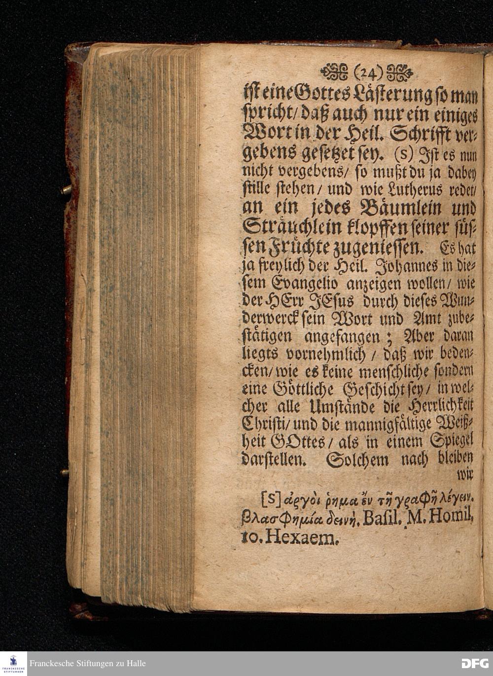 Quedlinburgisches Zeugniß / Oder Predigt Von der Offenbahrung der Herrlichkeit Christi / Uber das Evangelium Joh.II. V.1-11. Am II.Sonnt.nach Epiphan. In der Quedlinburgischen Schloß=Kirchen bey zufälliger Gelegenheit / auff geschehene Ansuchung abgeleget / Und in etwas erweitert zum dritten mal in Druck gegeben Von M. Aug. Hermañ Francken / SS.Theol.P.Ord.& P.Glauch. HALLE / Gedruckt bey Johann Grunerten / 1701.