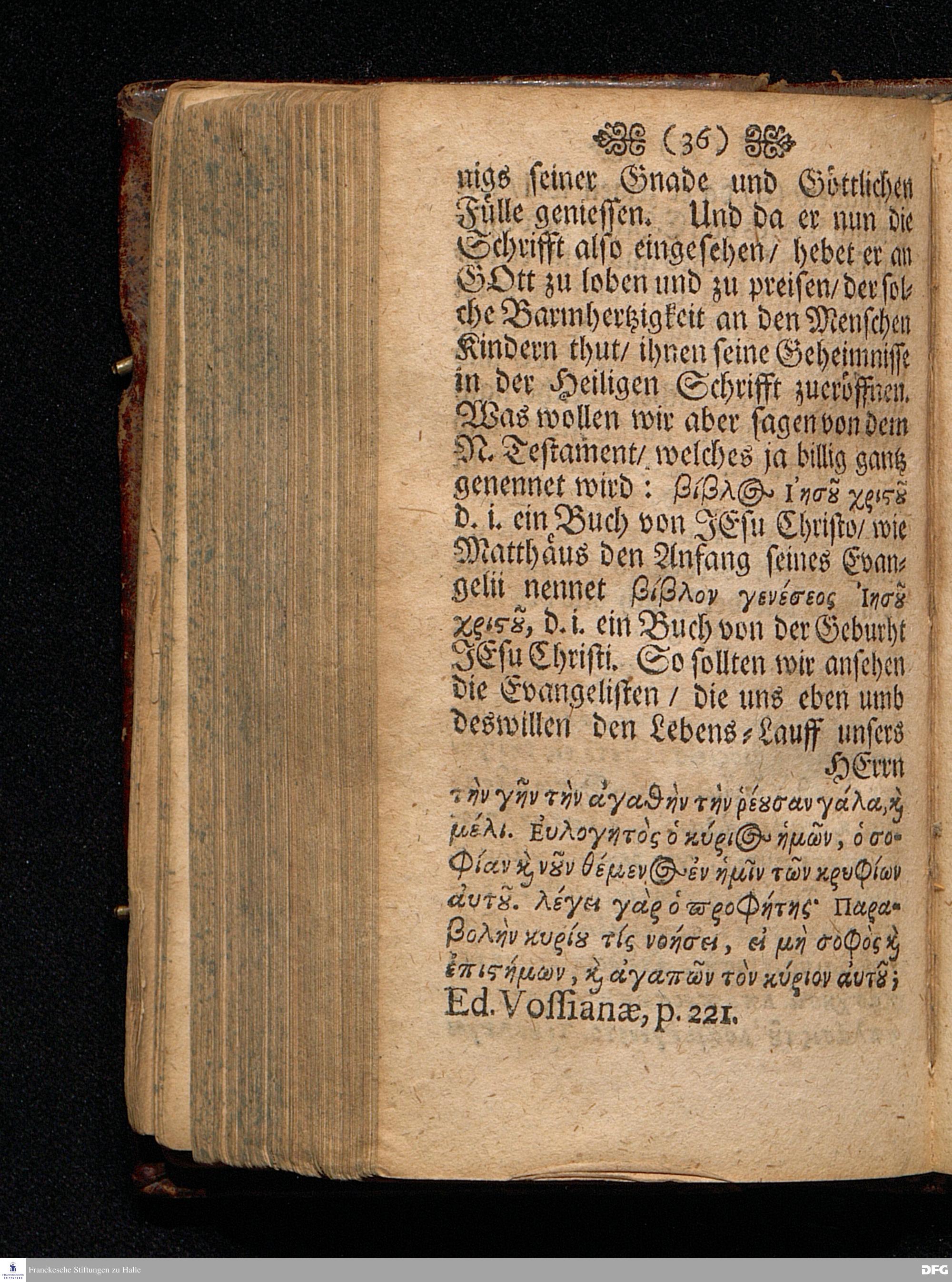 Quedlinburgisches Zeugniß / Oder Predigt Von der Offenbahrung der Herrlichkeit Christi / Uber das Evangelium Joh.II. V.1-11. Am II.Sonnt.nach Epiphan. In der Quedlinburgischen Schloß=Kirchen bey zufälliger Gelegenheit / auff geschehene Ansuchung abgeleget / Und in etwas erweitert zum dritten mal in Druck gegeben Von M. Aug. Hermañ Francken / SS.Theol.P.Ord.& P.Glauch. HALLE / Gedruckt bey Johann Grunerten / 1701.