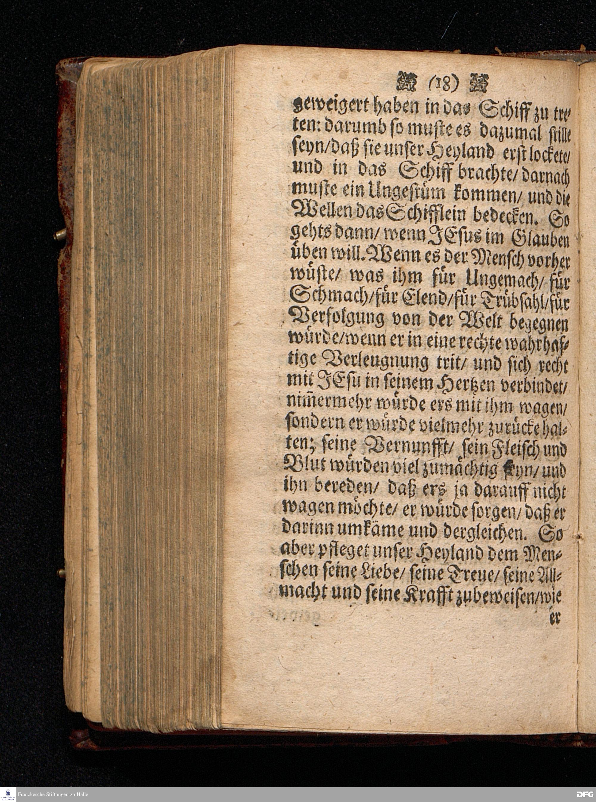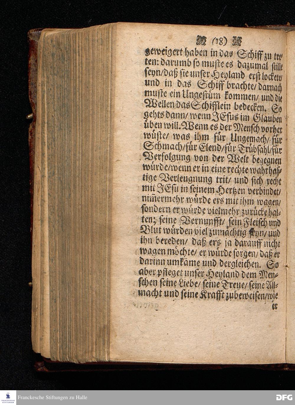 Die Ubung des Glaubens im Creutz / oder: wie JEsus die Seinigen im Glauben pflege zu üben / In einer Predigt Uber das Evangelium Matth.VIII. v.23-27. Am IV.Sonntage nach Epiphan. Anno 1700. In der St.Georgen=Kirche zu Glaucha an Halle vorgestellet von M.August Hermann Francken / S.S.Theol.P.Ord.& Past.Glauch. Halle / in Verlegung des Waysenhauses.