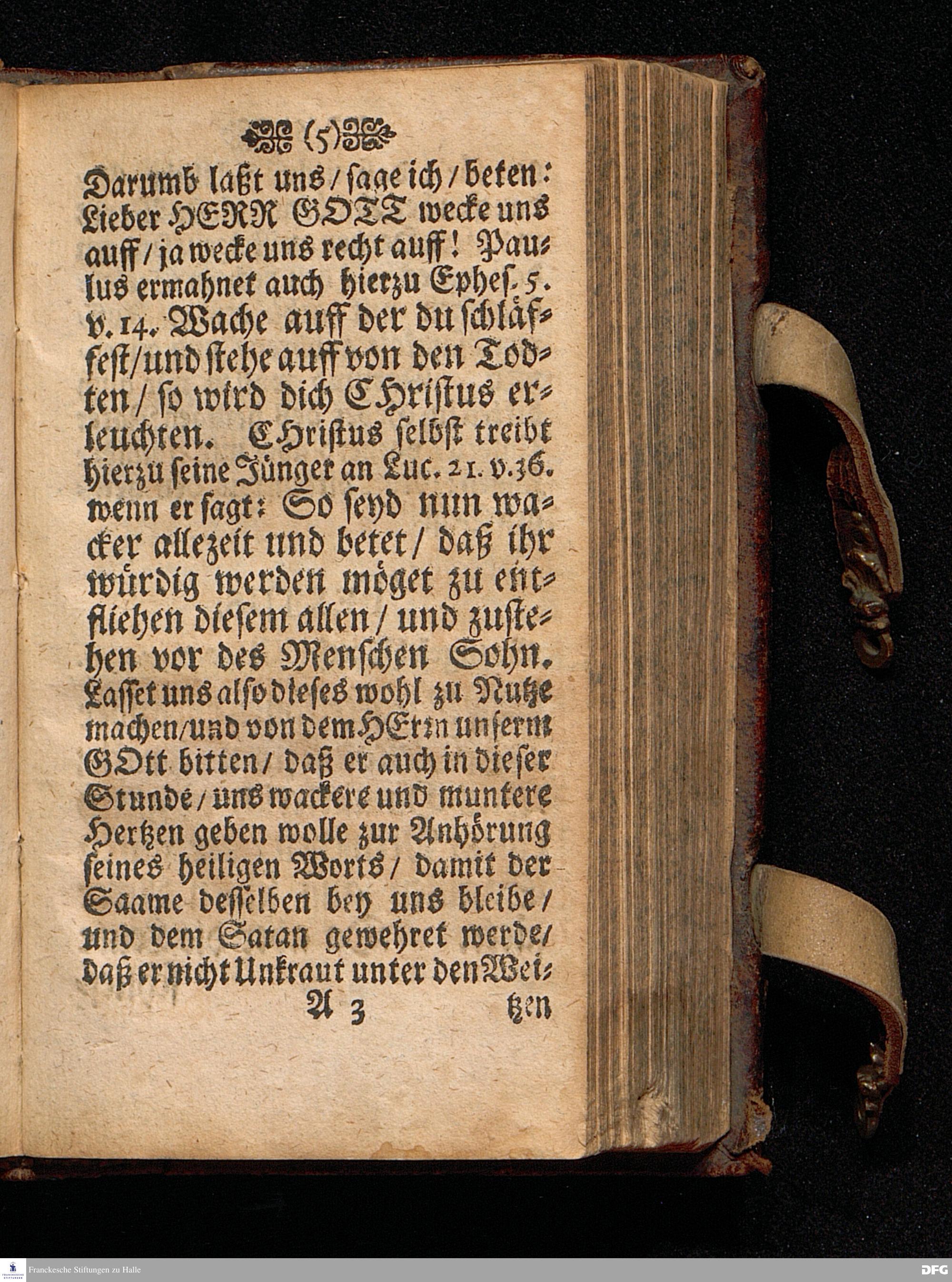 Die Gefährlichkeit des Schlaffs der Sicherheit / Am V.Sonntag nach Epiphan. ANNO 1698 In einer Predigt Aus dem Evangelio Matth.XIII. v.24--30. In der St.Georgen=Kirche zu Glaucha an Halle vorgestellet / von August Hermann Francken / S.S.Theol.Profess.P.Ordin.& Past.Glauch. HALLE / Druckts Christian Henckel / Univ.Buchdrucker.