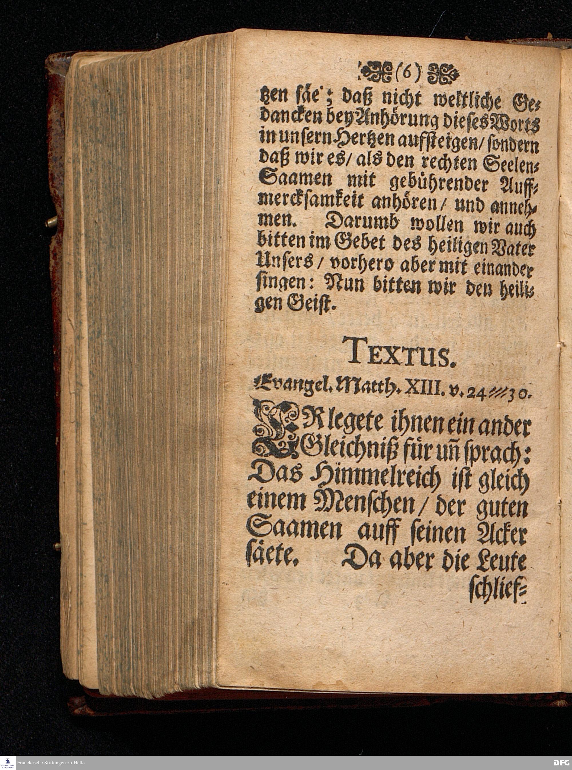 Die Gefährlichkeit des Schlaffs der Sicherheit / Am V.Sonntag nach Epiphan. ANNO 1698 In einer Predigt Aus dem Evangelio Matth.XIII. v.24--30. In der St.Georgen=Kirche zu Glaucha an Halle vorgestellet / von August Hermann Francken / S.S.Theol.Profess.P.Ordin.& Past.Glauch. HALLE / Druckts Christian Henckel / Univ.Buchdrucker.