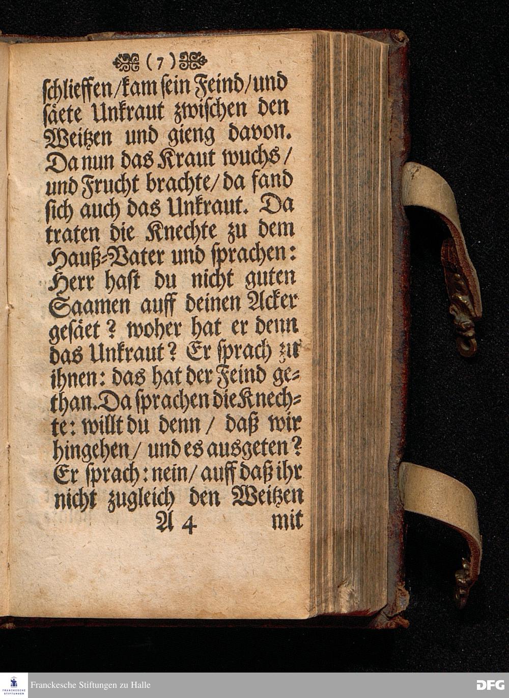 Die Gefährlichkeit des Schlaffs der Sicherheit / Am V.Sonntag nach Epiphan. ANNO 1698 In einer Predigt Aus dem Evangelio Matth.XIII. v.24--30. In der St.Georgen=Kirche zu Glaucha an Halle vorgestellet / von August Hermann Francken / S.S.Theol.Profess.P.Ordin.& Past.Glauch. HALLE / Druckts Christian Henckel / Univ.Buchdrucker.