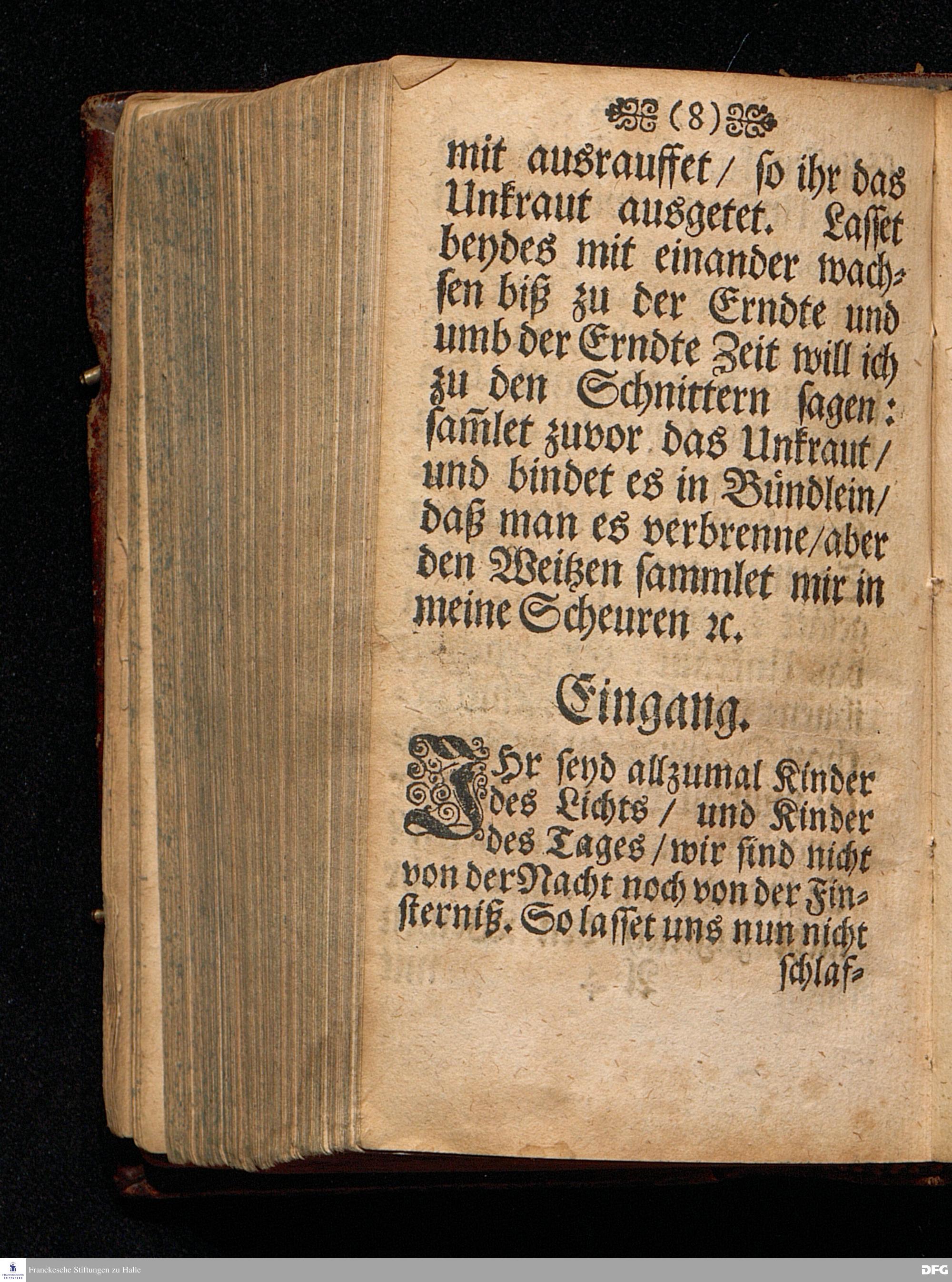 Die Gefährlichkeit des Schlaffs der Sicherheit / Am V.Sonntag nach Epiphan. ANNO 1698 In einer Predigt Aus dem Evangelio Matth.XIII. v.24--30. In der St.Georgen=Kirche zu Glaucha an Halle vorgestellet / von August Hermann Francken / S.S.Theol.Profess.P.Ordin.& Past.Glauch. HALLE / Druckts Christian Henckel / Univ.Buchdrucker.