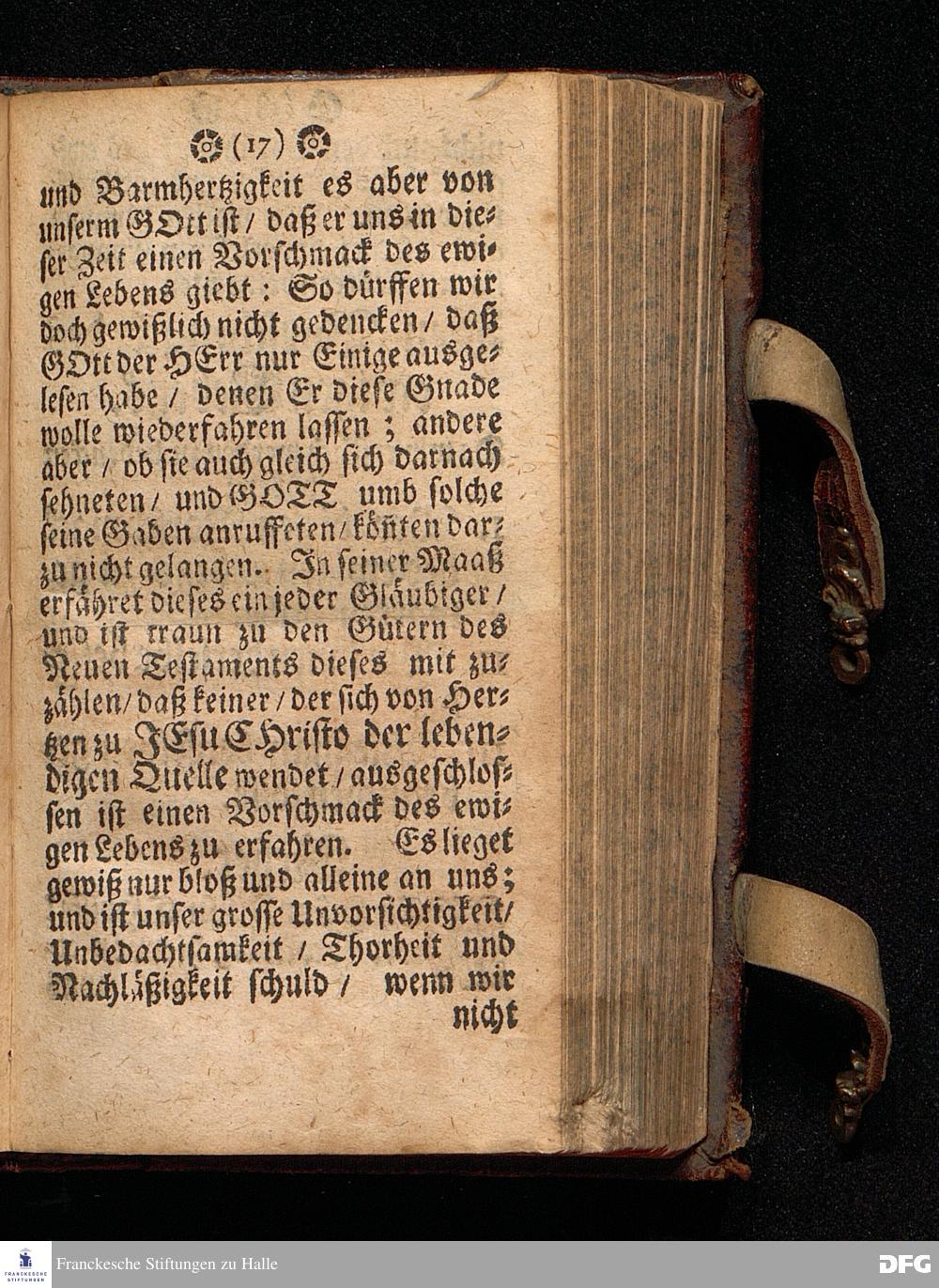 Der Vorschmack des ewigen Lebens / In einer Predigt Uber das Evangelium Matth.XVII, v.1==9. am 6.Sonntag nach Epiphan. Anno 1698. In der St.Georgen=Kirche zu Glaucha an Halle vorgestellet Und nunmehro zum andern mal herausgegeben / von M.August Hermann Francken / SS.Theol.Gr.& OO.LL.P.P.Ord.& P.Glauch. HALLE / Druckts Christian Henckel / 1699.