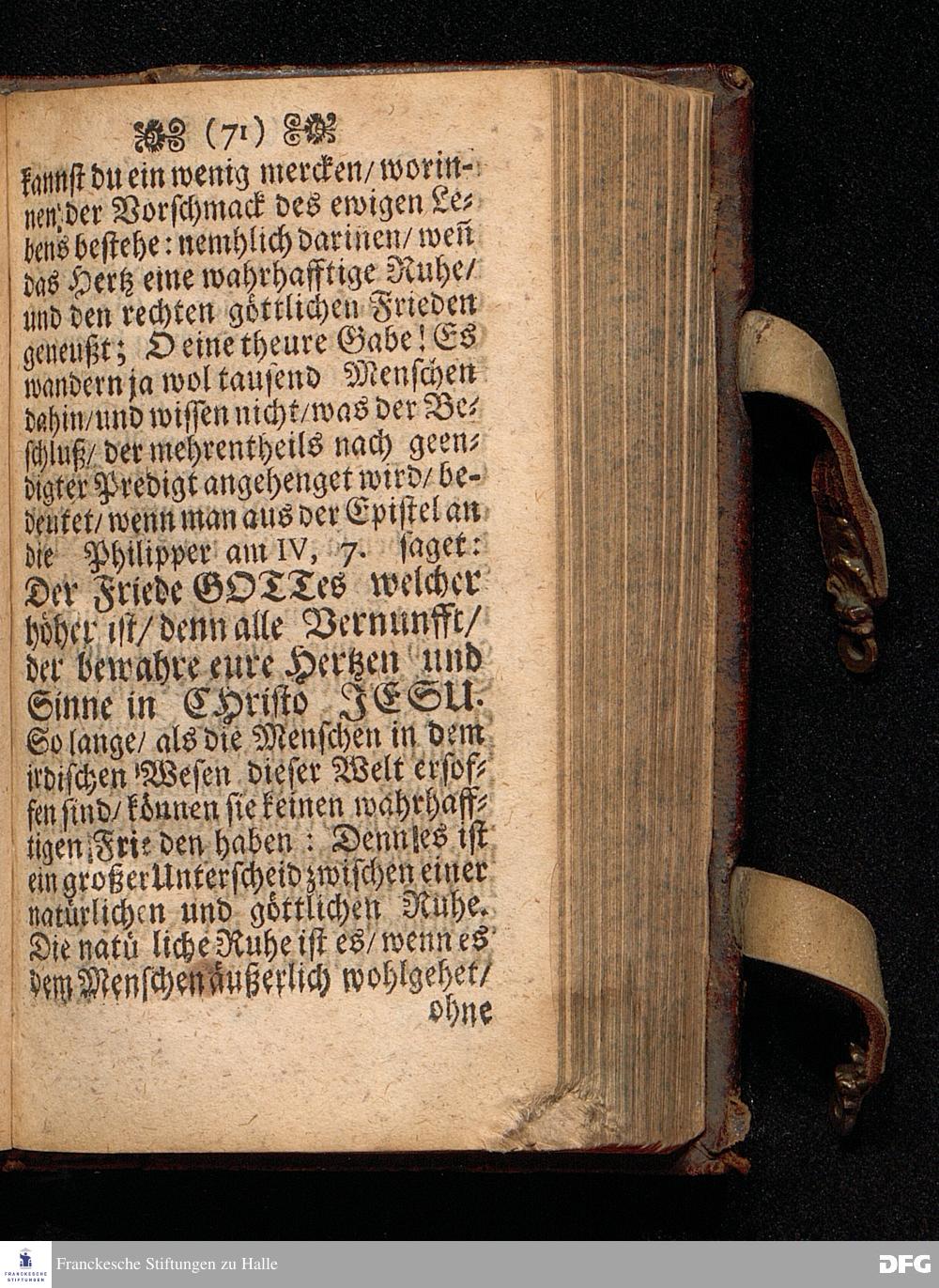 Der Vorschmack des ewigen Lebens / In einer Predigt Uber das Evangelium Matth.XVII, v.1==9. am 6.Sonntag nach Epiphan. Anno 1698. In der St.Georgen=Kirche zu Glaucha an Halle vorgestellet Und nunmehro zum andern mal herausgegeben / von M.August Hermann Francken / SS.Theol.Gr.& OO.LL.P.P.Ord.& P.Glauch. HALLE / Druckts Christian Henckel / 1699.