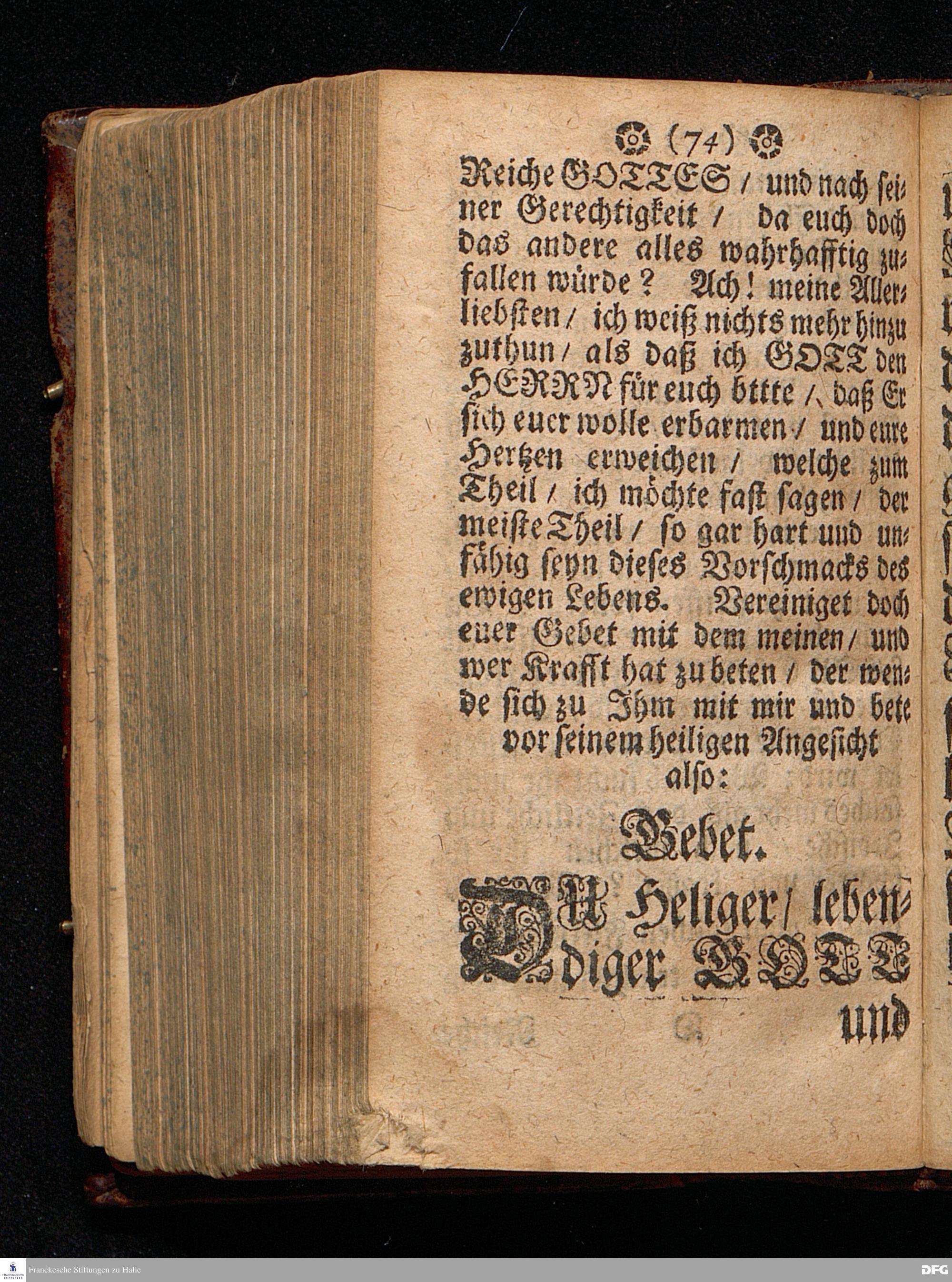 Der Vorschmack des ewigen Lebens / In einer Predigt Uber das Evangelium Matth.XVII, v.1==9. am 6.Sonntag nach Epiphan. Anno 1698. In der St.Georgen=Kirche zu Glaucha an Halle vorgestellet Und nunmehro zum andern mal herausgegeben / von M.August Hermann Francken / SS.Theol.Gr.& OO.LL.P.P.Ord.& P.Glauch. HALLE / Druckts Christian Henckel / 1699.