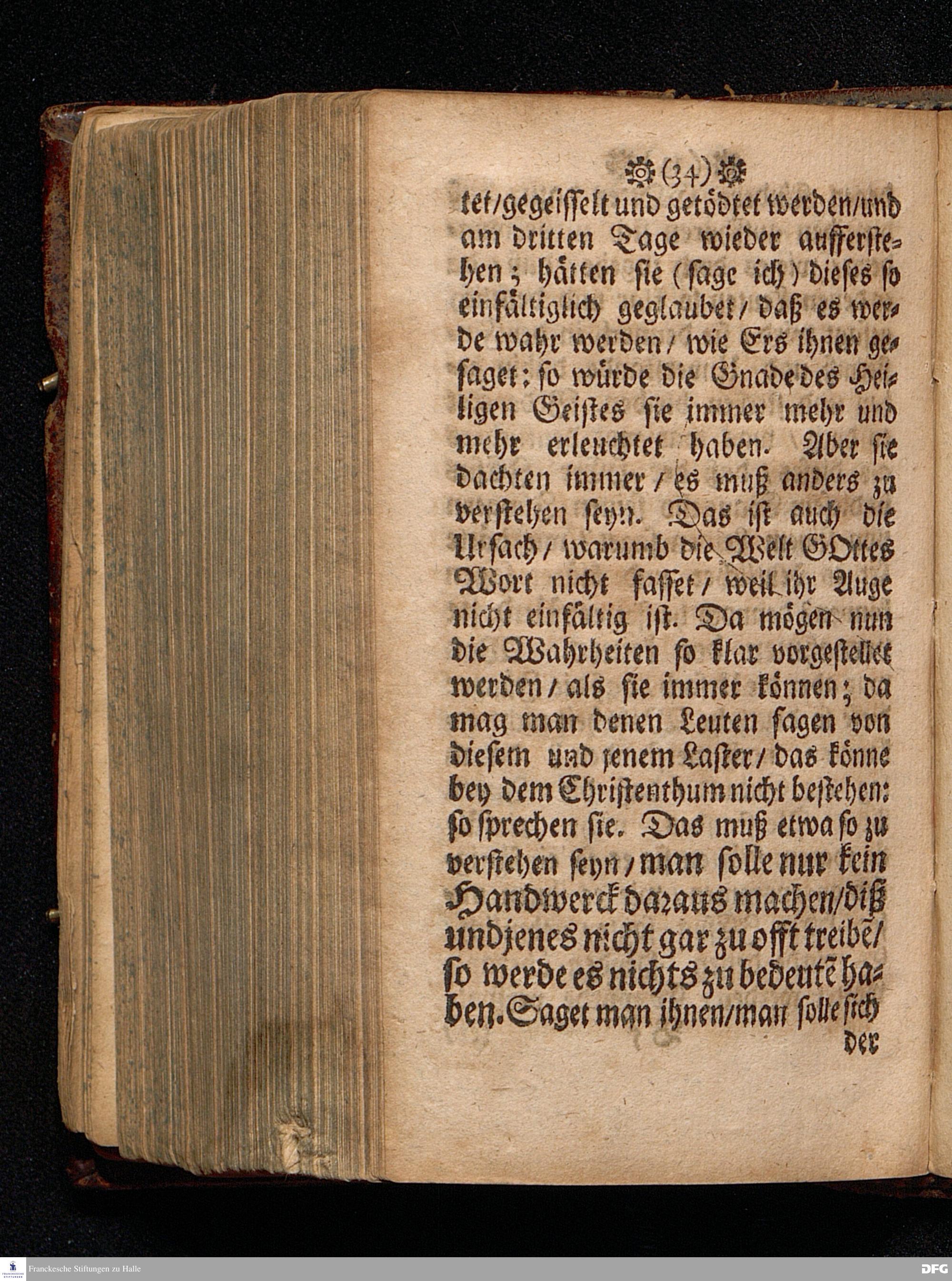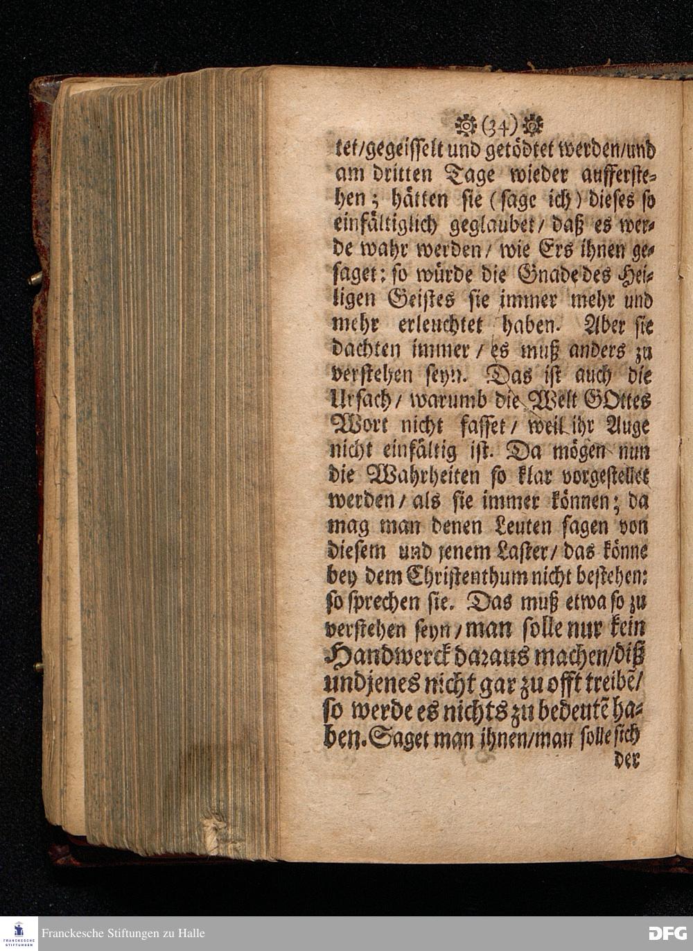Die Lehre von der Erleuchtung / In einer Predigt Uber das Evangelium Luc.XVIII, v.31--43. Am Soñtag Quinquagesimæ Anno 1698. In der St.Georgen=Kirche zu Glaucha an Halle vorgestellet und nun zum andern mal herausgegeben von M.August Hermañ Francken. Druckts Christoph Andreas Zeitler, U.B.