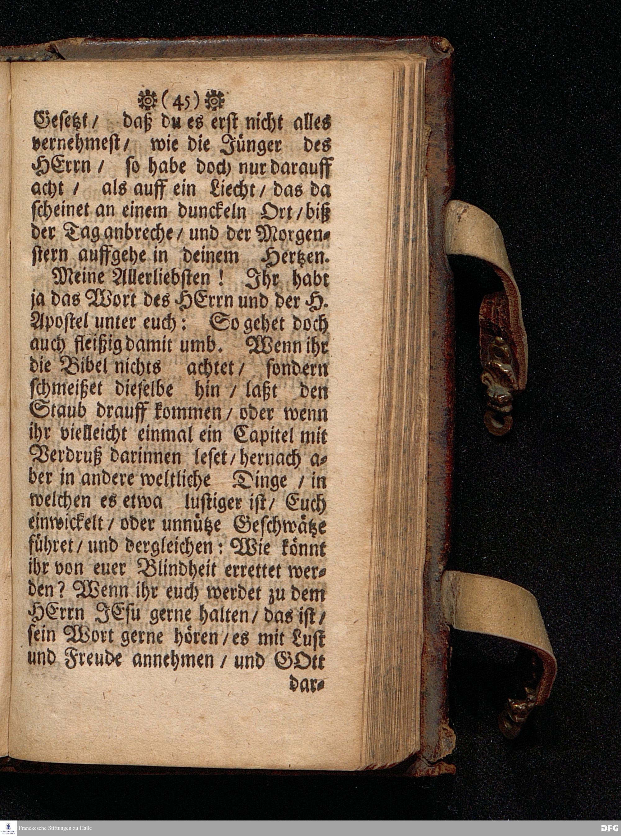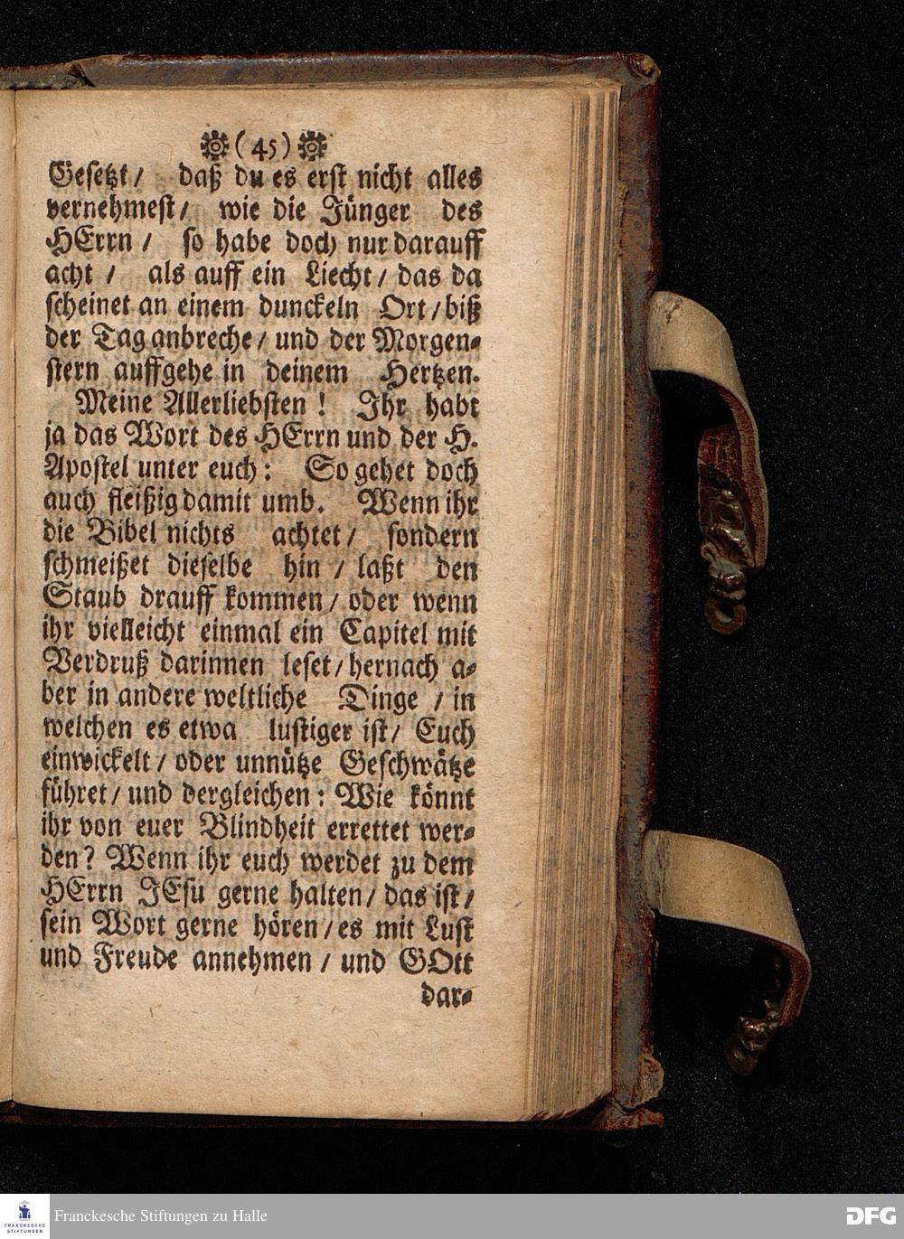 Die Lehre von der Erleuchtung / In einer Predigt Uber das Evangelium Luc.XVIII, v.31--43. Am Soñtag Quinquagesimæ Anno 1698. In der St.Georgen=Kirche zu Glaucha an Halle vorgestellet und nun zum andern mal herausgegeben von M.August Hermañ Francken. Druckts Christoph Andreas Zeitler, U.B.