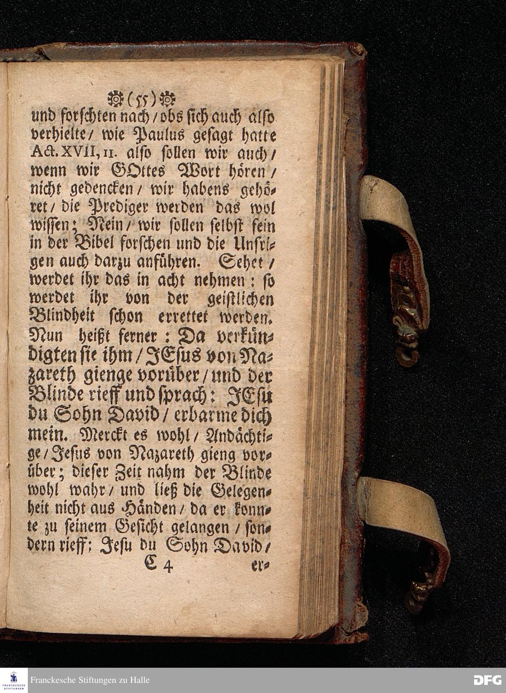 Die Lehre von der Erleuchtung / In einer Predigt Uber das Evangelium Luc.XVIII, v.31--43. Am Soñtag Quinquagesimæ Anno 1698. In der St.Georgen=Kirche zu Glaucha an Halle vorgestellet und nun zum andern mal herausgegeben von M.August Hermañ Francken. Druckts Christoph Andreas Zeitler, U.B.