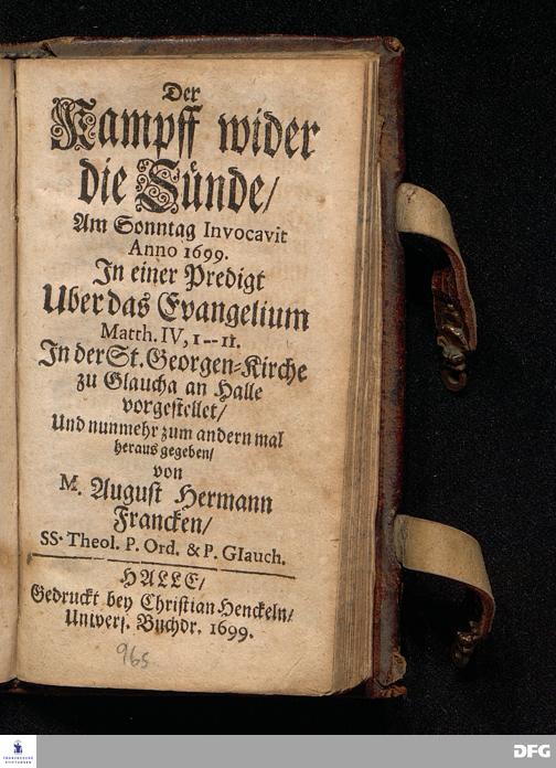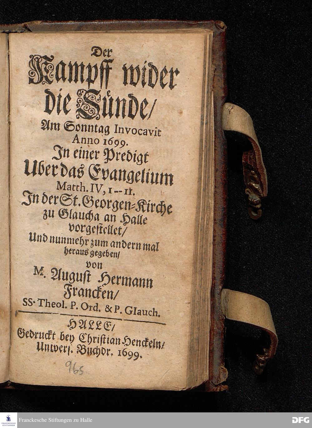 Der Kampff wider die Sünde / Am Sonntag Invocavit Anno 1699. In einer Predigt Uber das Evangelium Matth.IV, 1--11. In der St.Georgen=Kirche zu Glaucha an Halle vorgestellet / Und nunmehr zum andernmal herausgegeben / von M.August Hermann Francken / SS.Theol.P.Ord.& P.Glauch. HALLE / Gedruckt bey Christian Henckeln / Univers.Buchdr.1699.
