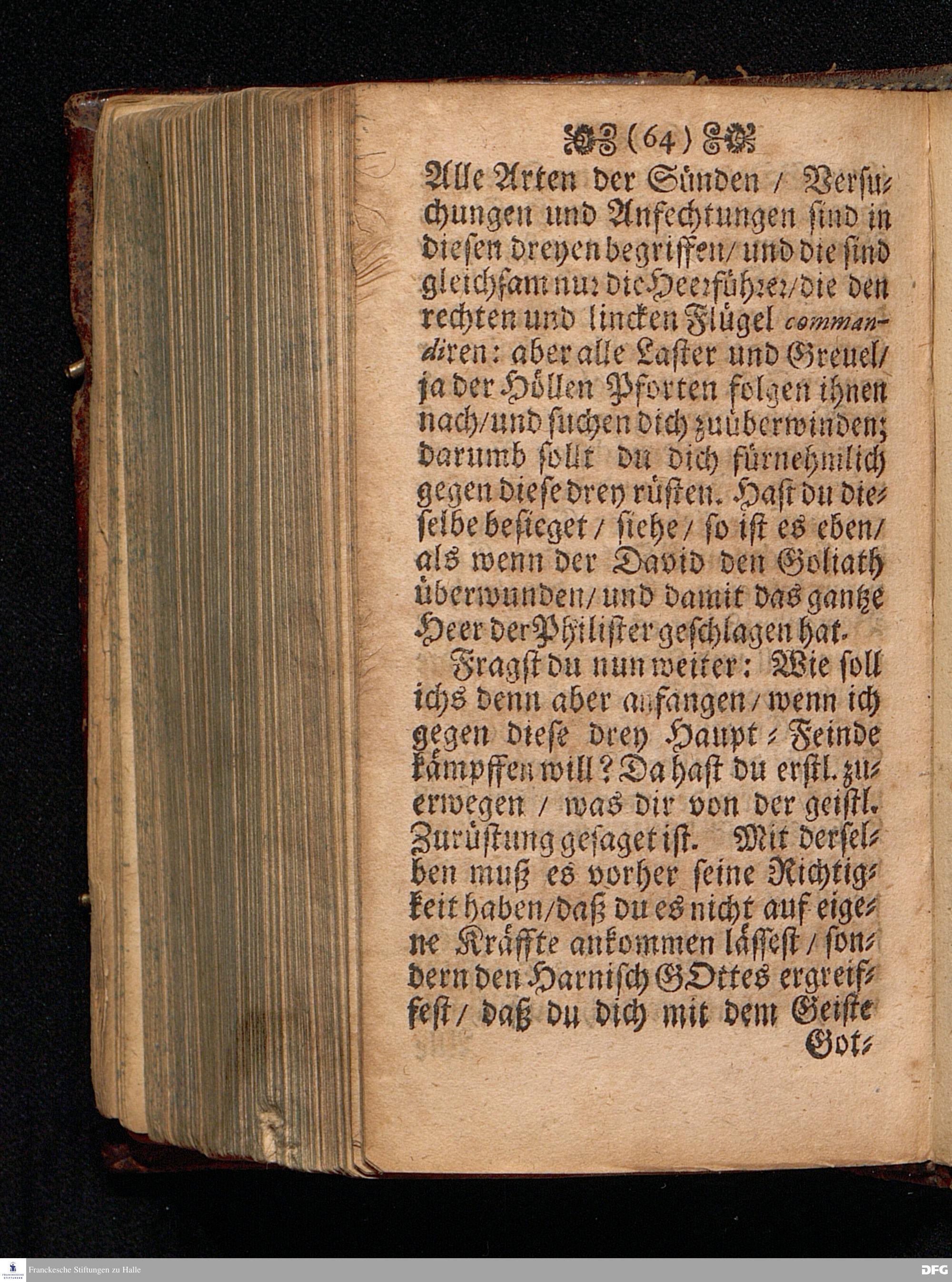 Der Kampff wider die Sünde / Am Sonntag Invocavit Anno 1699. In einer Predigt Uber das Evangelium Matth.IV, 1--11. In der St.Georgen=Kirche zu Glaucha an Halle vorgestellet / Und nunmehr zum andernmal herausgegeben / von M.August Hermann Francken / SS.Theol.P.Ord.& P.Glauch. HALLE / Gedruckt bey Christian Henckeln / Univers.Buchdr.1699.