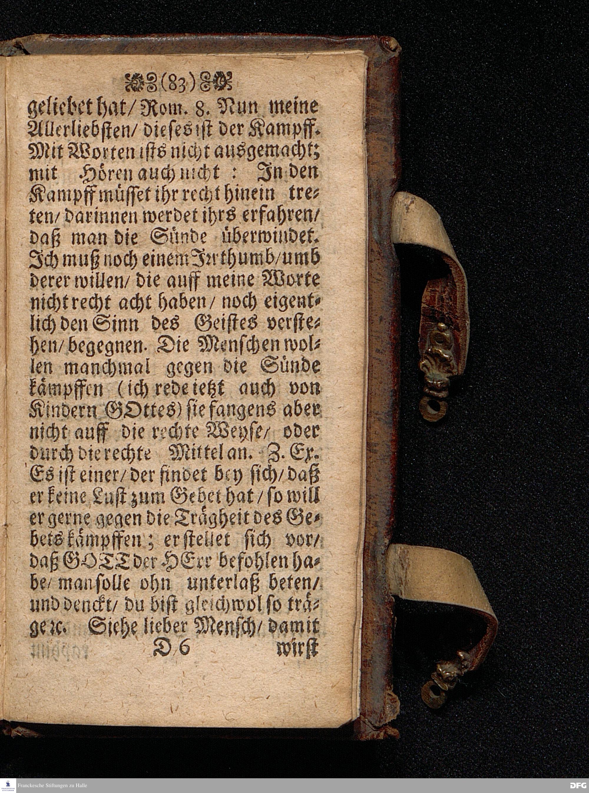 Der Kampff wider die Sünde / Am Sonntag Invocavit Anno 1699. In einer Predigt Uber das Evangelium Matth.IV, 1--11. In der St.Georgen=Kirche zu Glaucha an Halle vorgestellet / Und nunmehr zum andernmal herausgegeben / von M.August Hermann Francken / SS.Theol.P.Ord.& P.Glauch. HALLE / Gedruckt bey Christian Henckeln / Univers.Buchdr.1699.