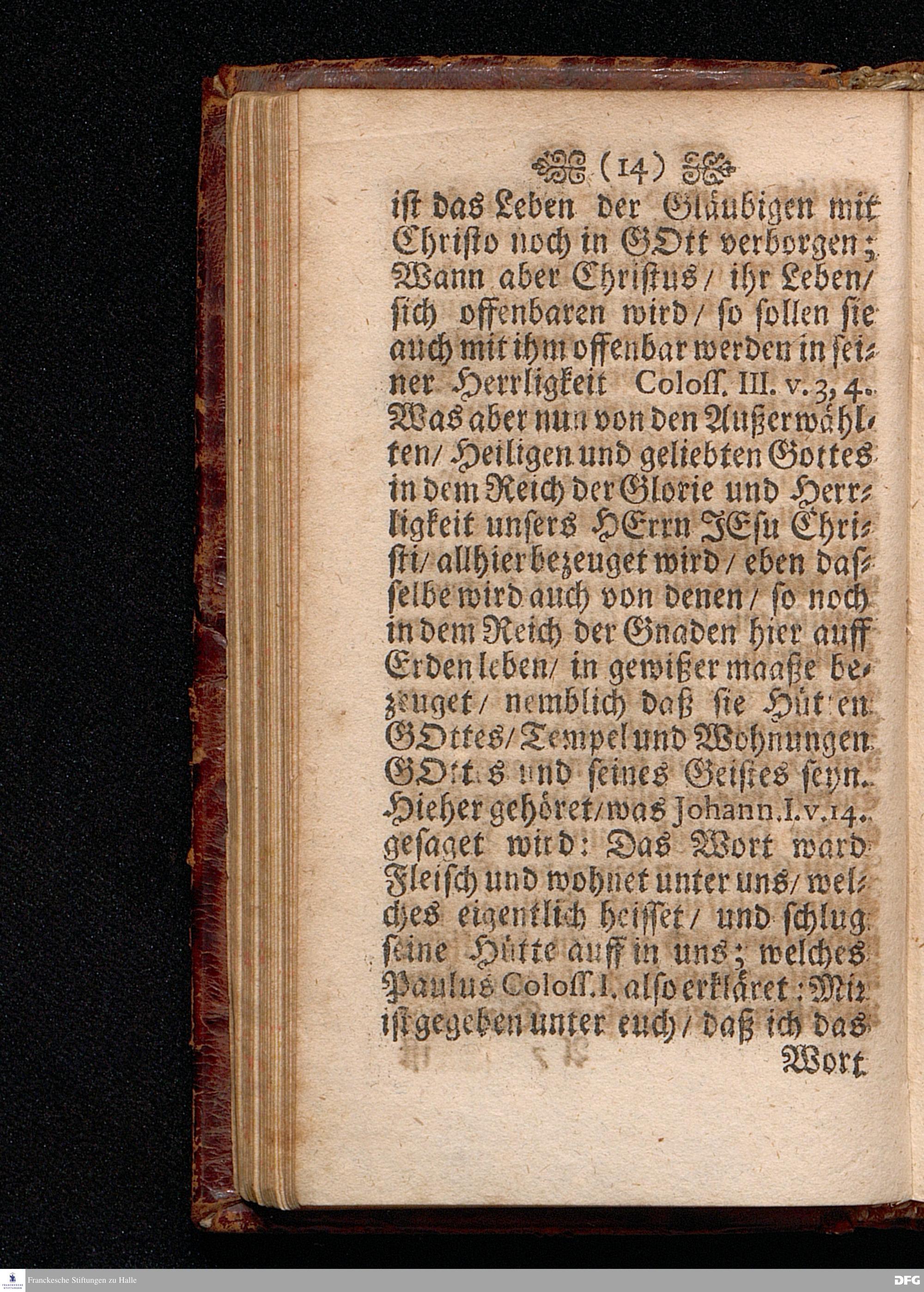 Die Wohnung GOttes bey den Menschen Am I.H.Pfingst=Tage Anno 1698 in einer Predigt Uber das Evangelium Joh.XIV. 23-31. In der St.Georgen Kirche zu Glaucha an Halle vorgestellet von August Hermann Francken S.S.Theol.P.Ord.& P.Glauch. HALLE / Druckts Christian Henckel / Univ.Buchdr. 1701.