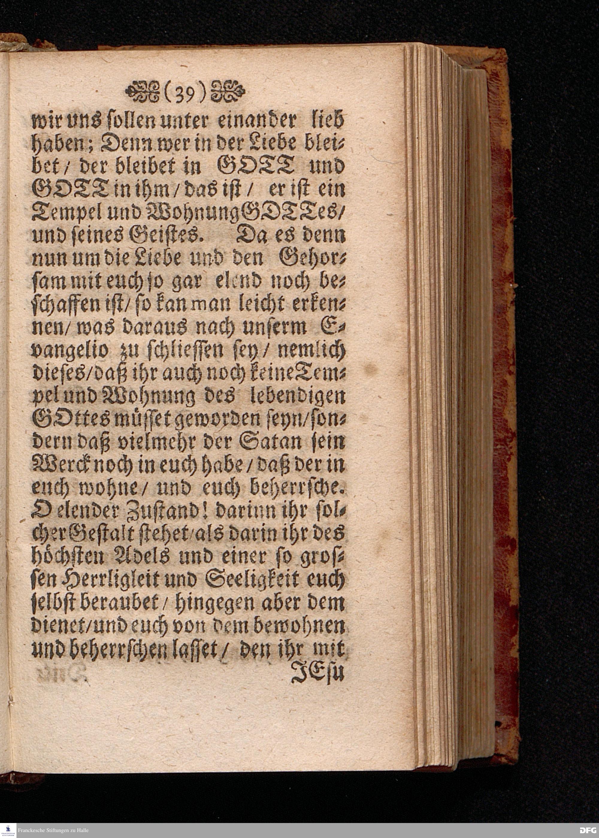 Die Wohnung GOttes bey den Menschen Am I.H.Pfingst=Tage Anno 1698 in einer Predigt Uber das Evangelium Joh.XIV. 23-31. In der St.Georgen Kirche zu Glaucha an Halle vorgestellet von August Hermann Francken S.S.Theol.P.Ord.& P.Glauch. HALLE / Druckts Christian Henckel / Univ.Buchdr. 1701.