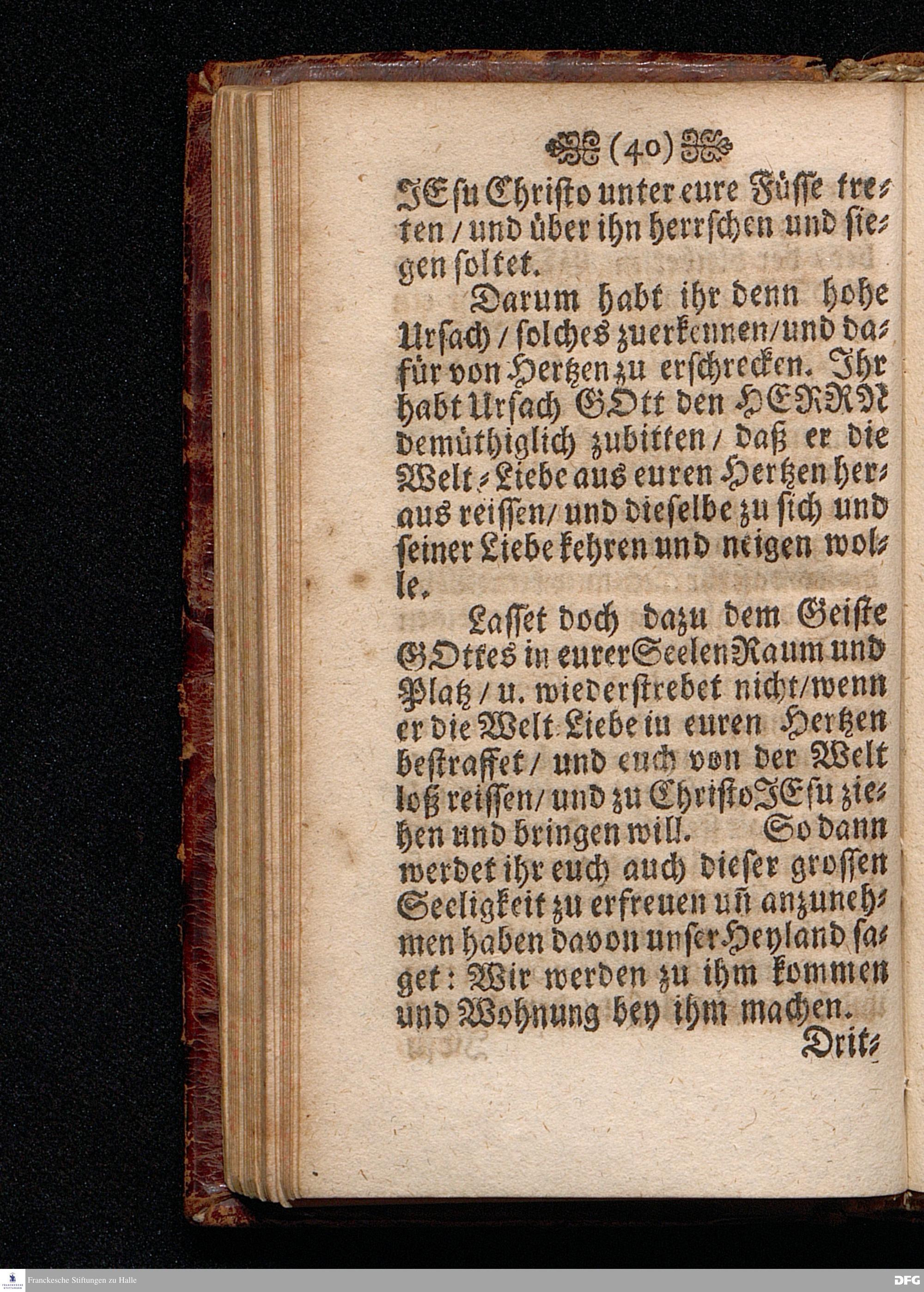 Die Wohnung GOttes bey den Menschen Am I.H.Pfingst=Tage Anno 1698 in einer Predigt Uber das Evangelium Joh.XIV. 23-31. In der St.Georgen Kirche zu Glaucha an Halle vorgestellet von August Hermann Francken S.S.Theol.P.Ord.& P.Glauch. HALLE / Druckts Christian Henckel / Univ.Buchdr. 1701.