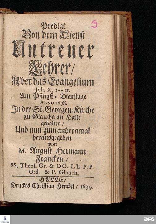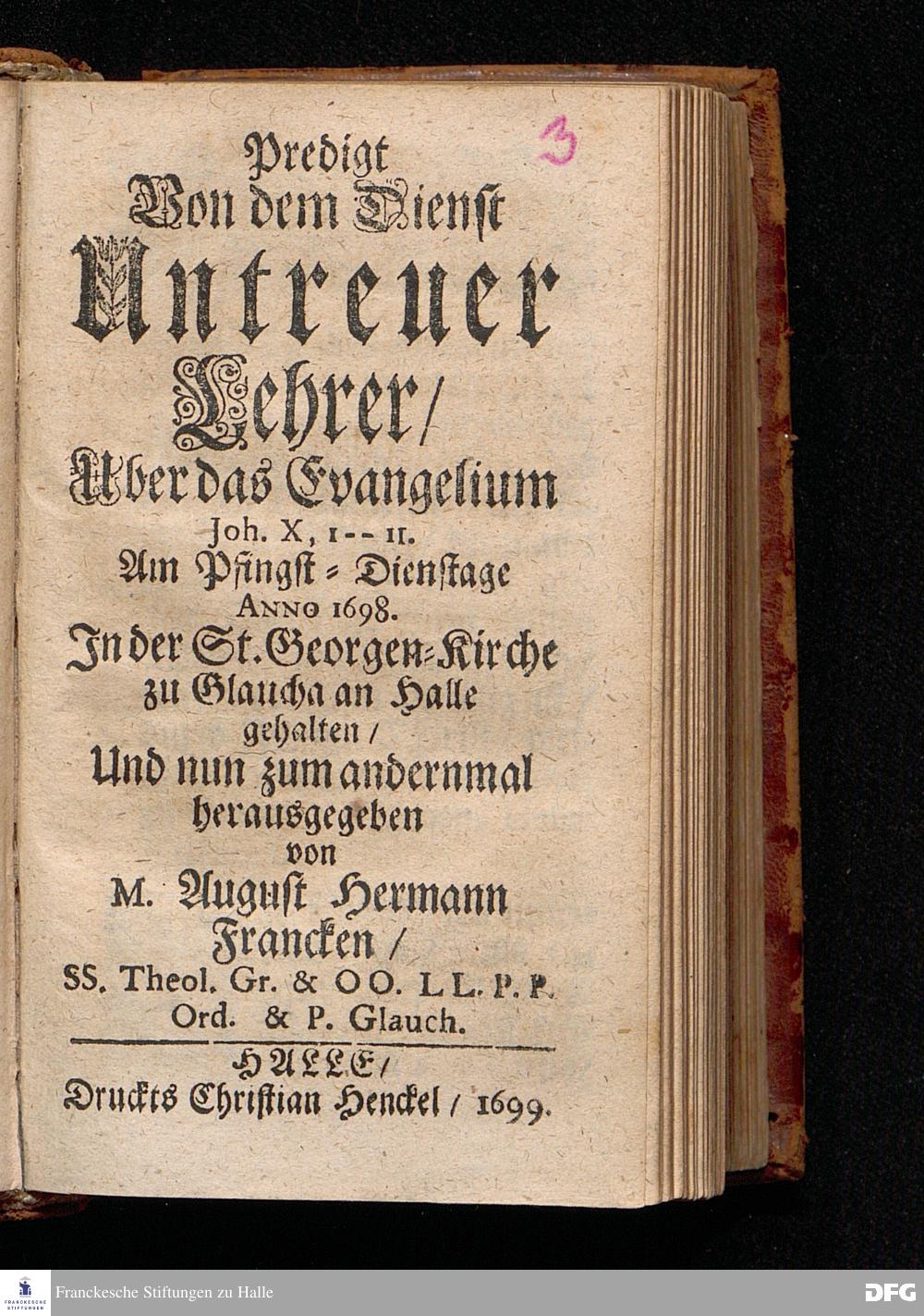 Predigt Von dem Dienst Untreuer Lehrer / Uber das Evangelium Joh.X, 1--11. Am Pfingst=Dienstage ANNO 1698. In der St.Georgen=Kirche zu Glaucha an Halle gehalten / Und nun zum andernmal herausgegeben von M.August Hermann Francken / SS.Theol.Gr.& OO.LL.P.P.Ord.& P.Glauch. HALLE / Druckts Christian Henckel / 1699.