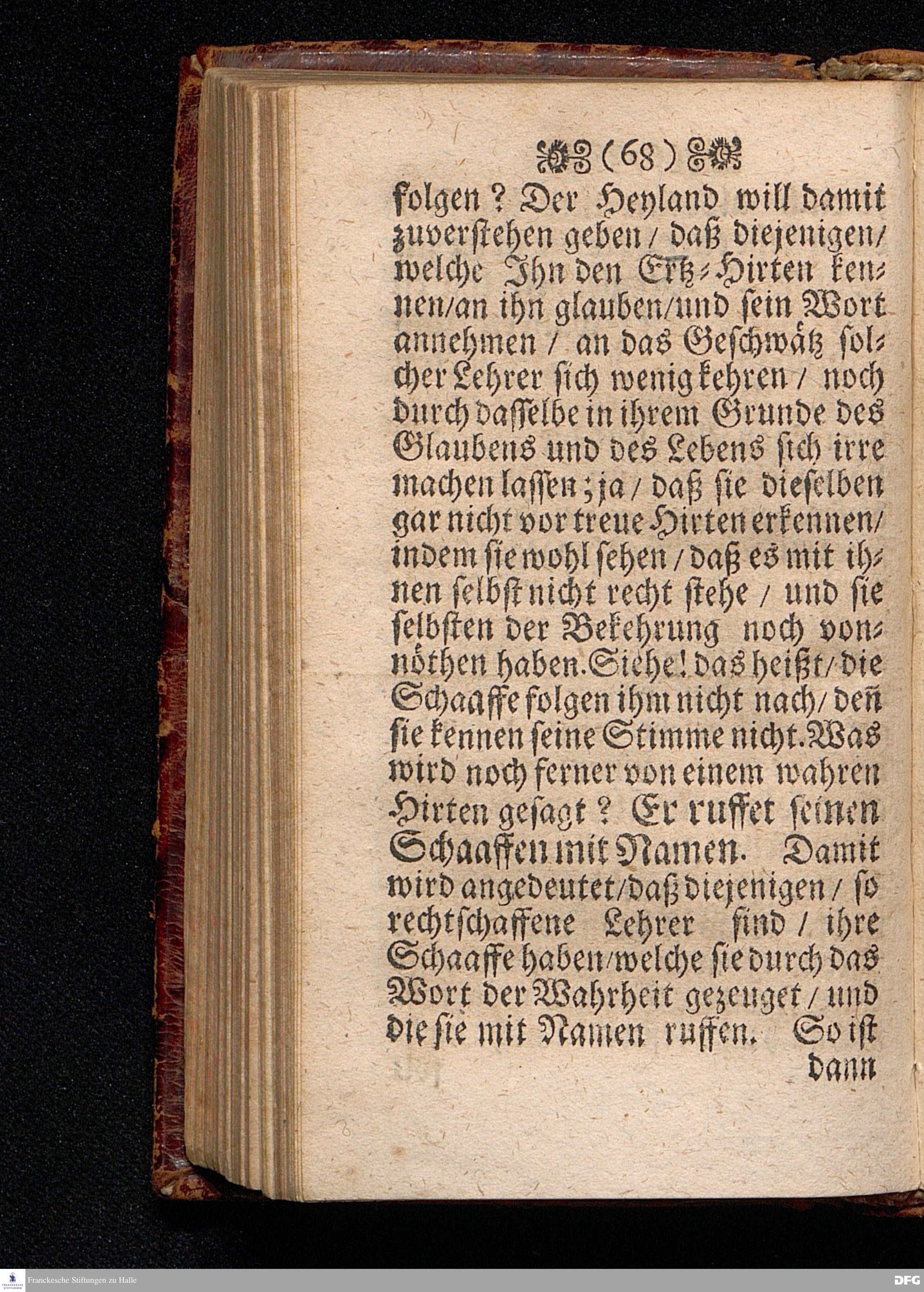Predigt Von dem Dienst Untreuer Lehrer / Uber das Evangelium Joh.X, 1--11. Am Pfingst=Dienstage ANNO 1698. In der St.Georgen=Kirche zu Glaucha an Halle gehalten / Und nun zum andernmal herausgegeben von M.August Hermann Francken / SS.Theol.Gr.& OO.LL.P.P.Ord.& P.Glauch. HALLE / Druckts Christian Henckel / 1699.
