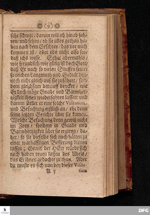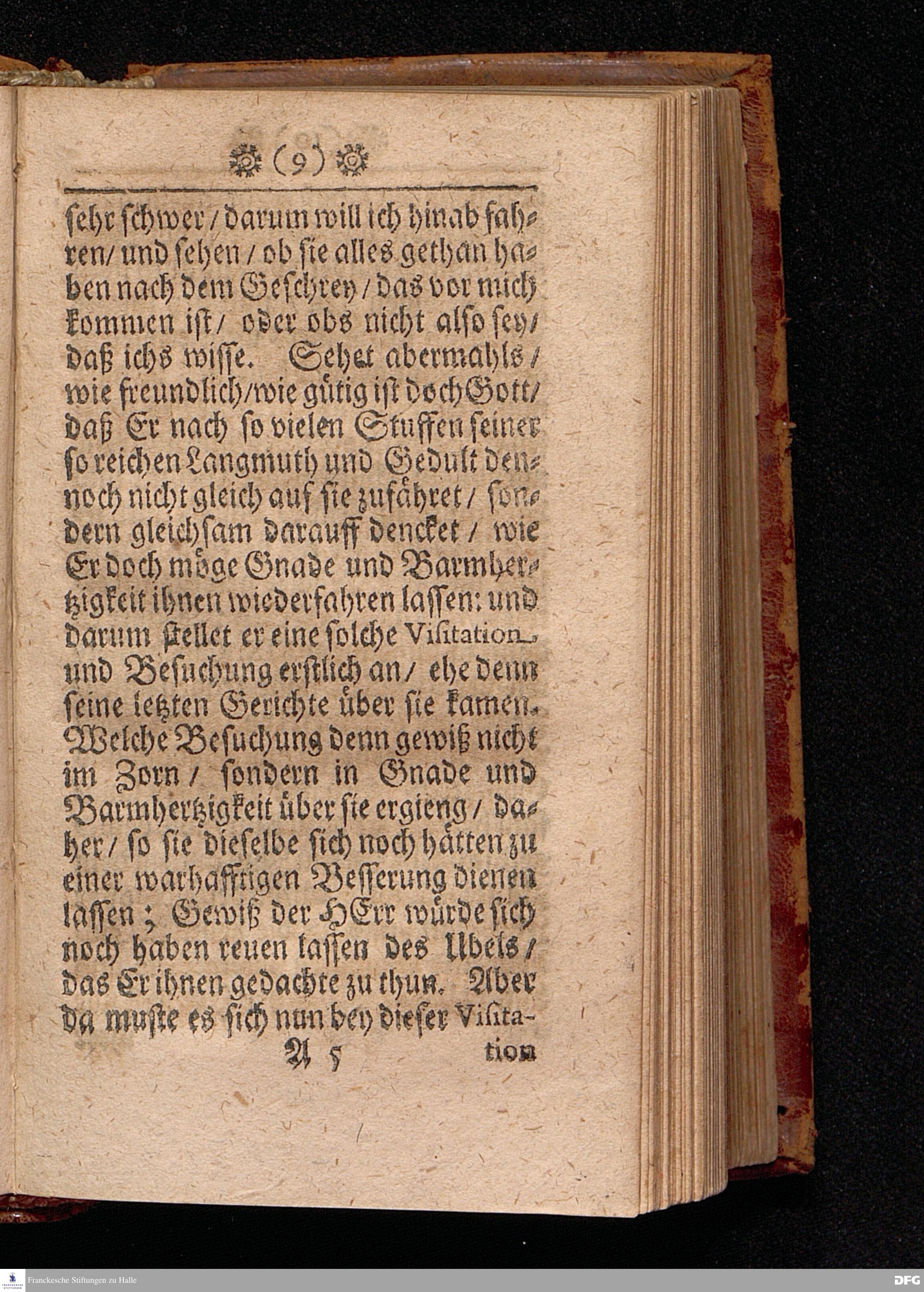 Die Göttliche VISITATION oder Heimsuchung Der erbarmenden Liebe GOttes. Am Fest Johannis des Täuffers / Anno 1700. In einer Predigt Uber das Evangelium Luc.I, v.57--80. In der St.Georgen=Kirche zu Glaucha an Halle vorgestellet von M.August Hermann Francken / S.S.Theol.P.P.Ord.& Past.Glauch. HALLE / Gedruckt bey Johann Grunern / 1702.