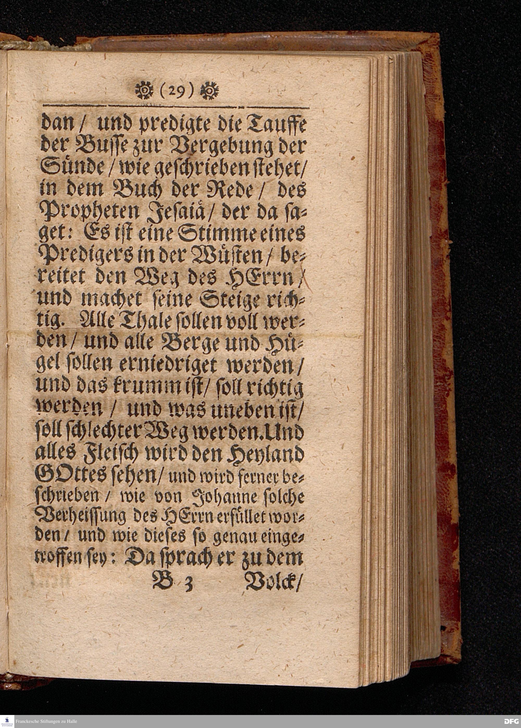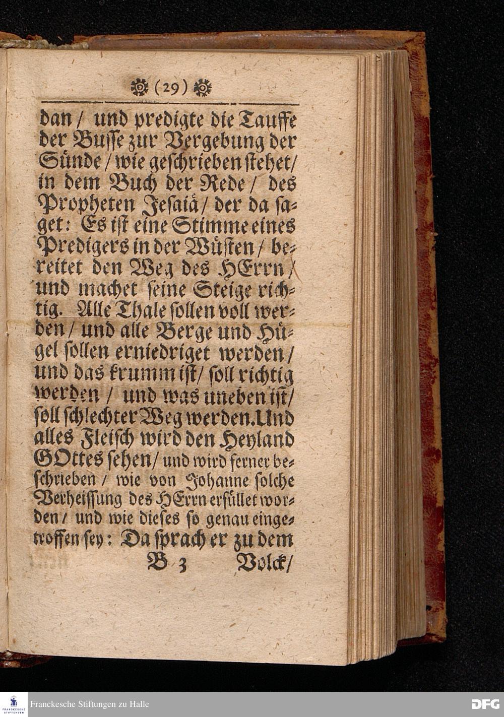 Die Göttliche VISITATION oder Heimsuchung Der erbarmenden Liebe GOttes. Am Fest Johannis des Täuffers / Anno 1700. In einer Predigt Uber das Evangelium Luc.I, v.57--80. In der St.Georgen=Kirche zu Glaucha an Halle vorgestellet von M.August Hermann Francken / S.S.Theol.P.P.Ord.& Past.Glauch. HALLE / Gedruckt bey Johann Grunern / 1702.