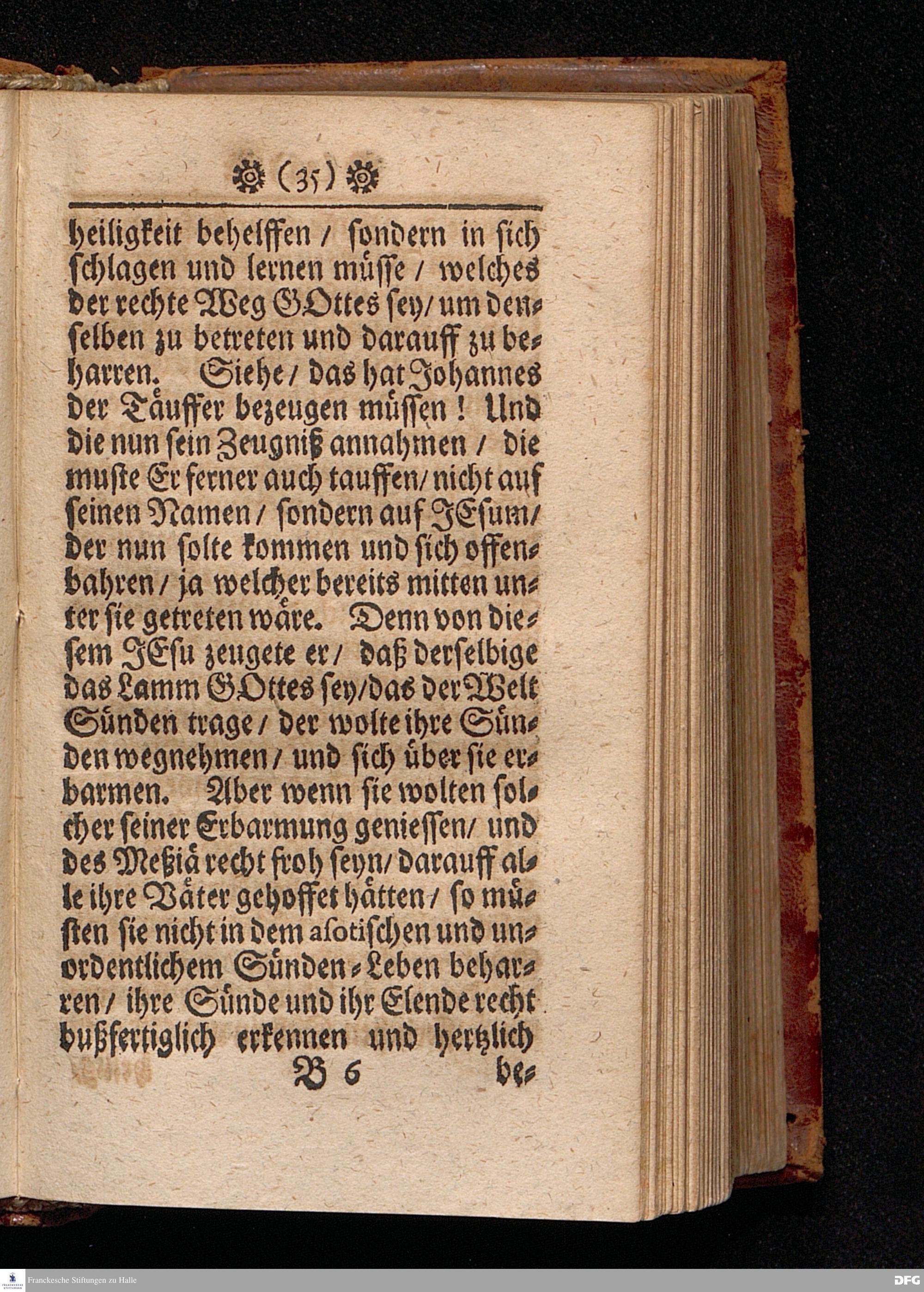 Die Göttliche VISITATION oder Heimsuchung Der erbarmenden Liebe GOttes. Am Fest Johannis des Täuffers / Anno 1700. In einer Predigt Uber das Evangelium Luc.I, v.57--80. In der St.Georgen=Kirche zu Glaucha an Halle vorgestellet von M.August Hermann Francken / S.S.Theol.P.P.Ord.& Past.Glauch. HALLE / Gedruckt bey Johann Grunern / 1702.