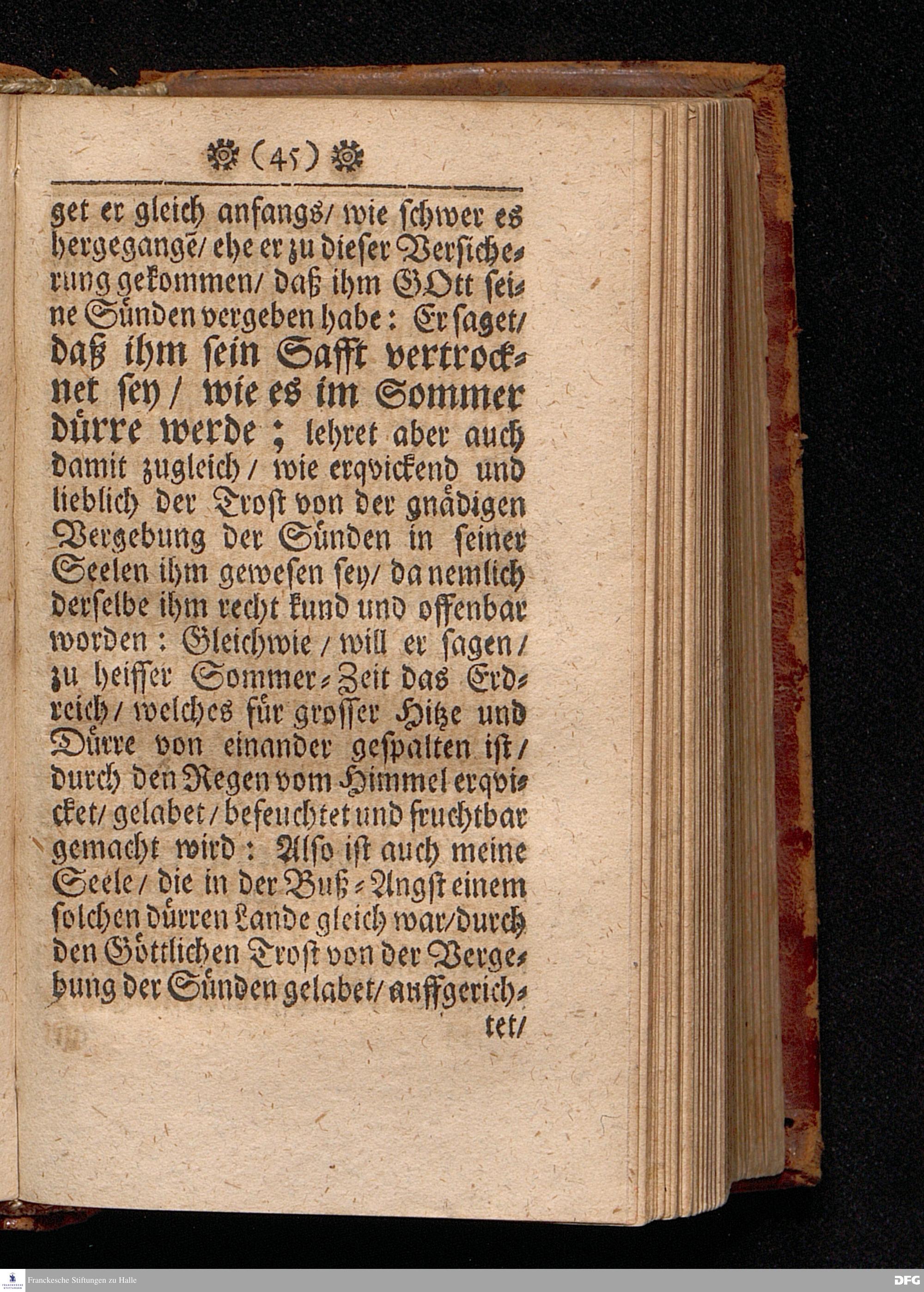 Die Göttliche VISITATION oder Heimsuchung Der erbarmenden Liebe GOttes. Am Fest Johannis des Täuffers / Anno 1700. In einer Predigt Uber das Evangelium Luc.I, v.57--80. In der St.Georgen=Kirche zu Glaucha an Halle vorgestellet von M.August Hermann Francken / S.S.Theol.P.P.Ord.& Past.Glauch. HALLE / Gedruckt bey Johann Grunern / 1702.