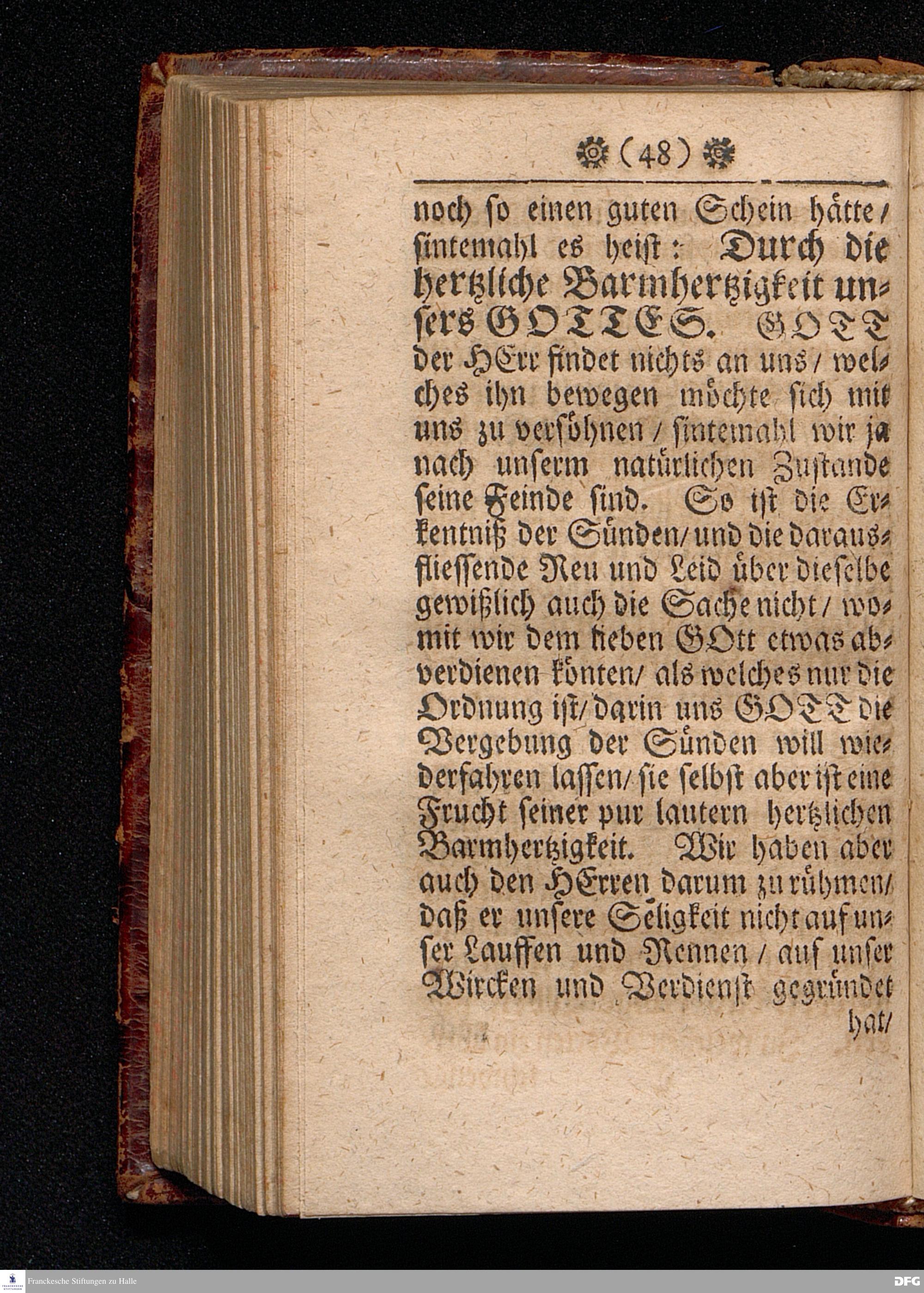 Die Göttliche VISITATION oder Heimsuchung Der erbarmenden Liebe GOttes. Am Fest Johannis des Täuffers / Anno 1700. In einer Predigt Uber das Evangelium Luc.I, v.57--80. In der St.Georgen=Kirche zu Glaucha an Halle vorgestellet von M.August Hermann Francken / S.S.Theol.P.P.Ord.& Past.Glauch. HALLE / Gedruckt bey Johann Grunern / 1702.