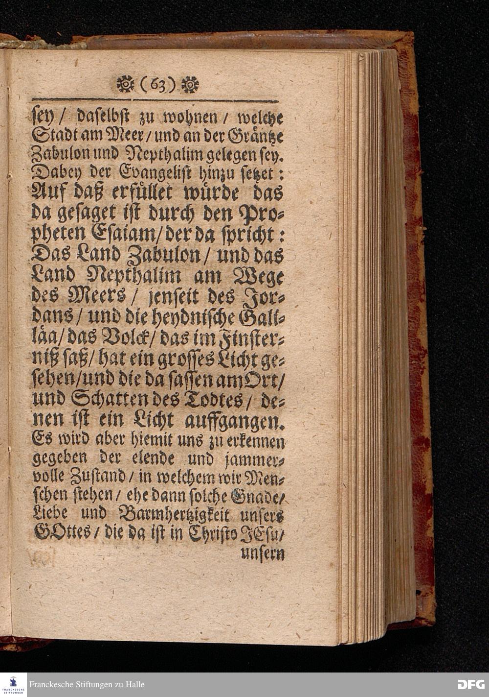 Die Göttliche VISITATION oder Heimsuchung Der erbarmenden Liebe GOttes. Am Fest Johannis des Täuffers / Anno 1700. In einer Predigt Uber das Evangelium Luc.I, v.57--80. In der St.Georgen=Kirche zu Glaucha an Halle vorgestellet von M.August Hermann Francken / S.S.Theol.P.P.Ord.& Past.Glauch. HALLE / Gedruckt bey Johann Grunern / 1702.