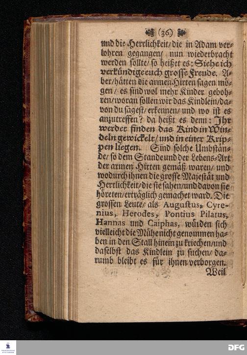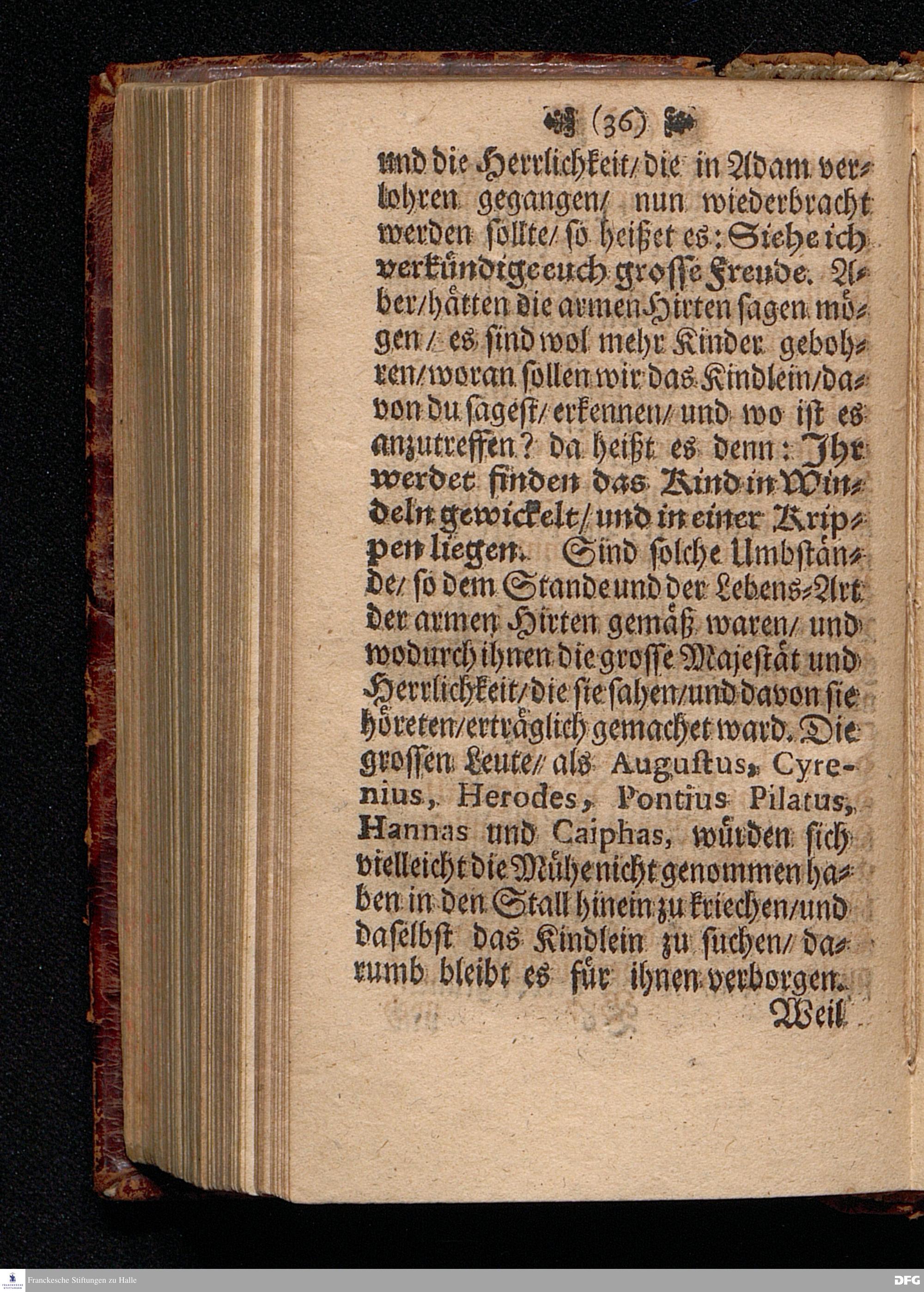 Der Geburts=Tag des I\-manuels Unsers HErrn JEsu Christi / In einer Predigt Uber das Evangelium Luc.II, 1-14. Am Ersten H.Weyhnachts=Tage Anno 1700. In der St.Georgen=Kirche zu Glaucha an Halle vorgestellet von August Hermann Francken / S.S.Theol.P.Ord.& P.Glauch. Halle / In Verleg.des Wäysenhauses.
