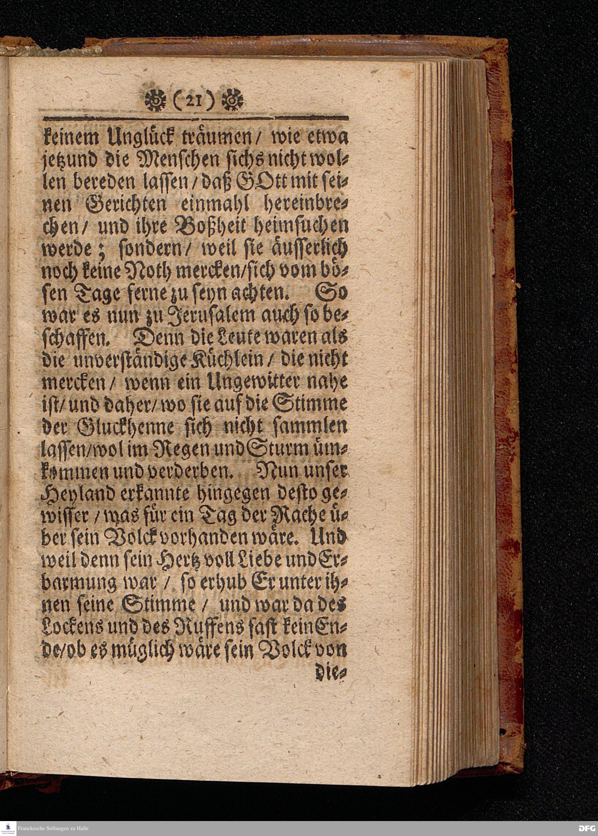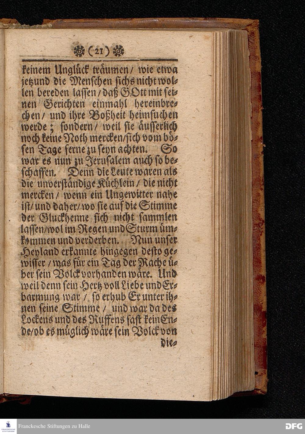 Die Versäumniß alles Guten durch die Versäumniß der Gnade In einer Predigt Uber das Evangelium Matth.XXIII. 34.-39. Am II.Christ=Feyertag / Anno 1701 [vielmehr 1700]. In der St.Georgen=Kirche zu Glaucha an Halle vorgestellet von Aug.Hermann Francken / S.S.Theol.P.Ord.& Past.Glauch. HALLE / Gedruckt bey Johann Grunern / 1702.