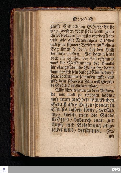 Die Versäumniß alles Guten durch die Versäumniß der Gnade In einer Predigt Uber das Evangelium Matth.XXIII. 34.-39. Am II.Christ=Feyertag / Anno 1701 [vielmehr 1700]. In der St.Georgen=Kirche zu Glaucha an Halle vorgestellet von Aug.Hermann Francken / S.S.Theol.P.Ord.& Past.Glauch. HALLE / Gedruckt bey Johann Grunern / 1702.